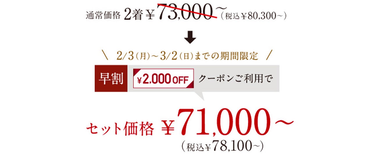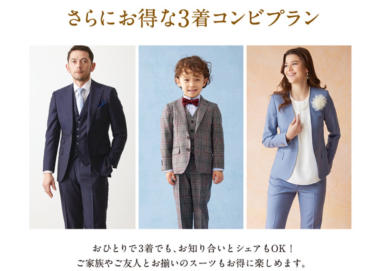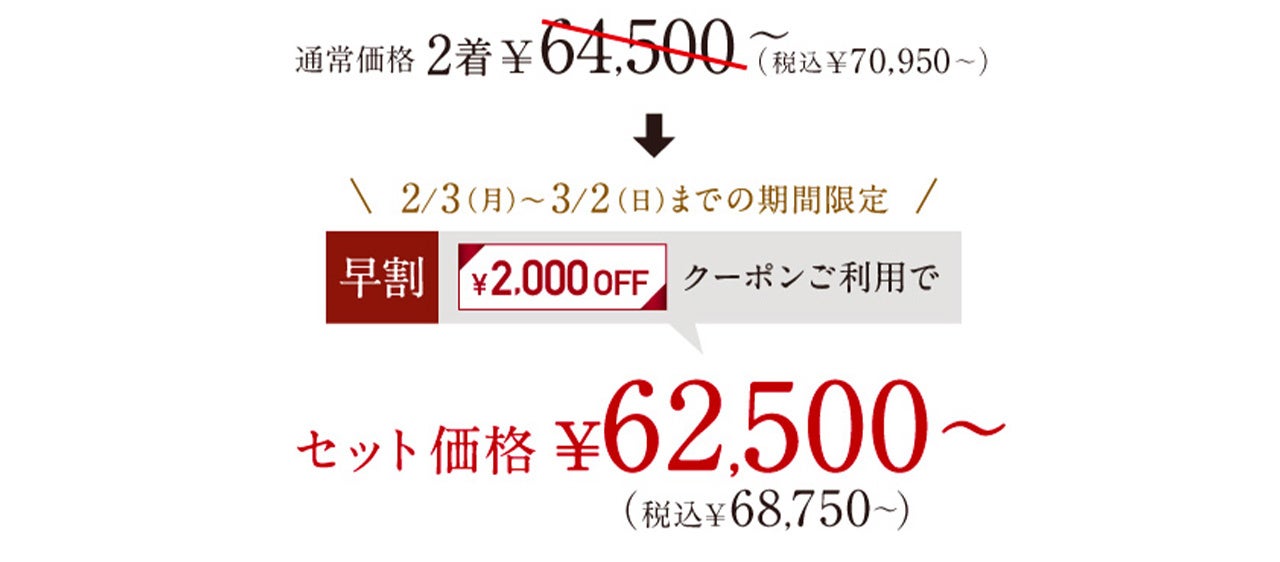 ※コンビプランとは・・・オーダースーツ2着以上ご購入していただいた場合の1着あたりのお値段です。組み合わせは自由ですので、異なる価格帯のオーダースーツと組み合わせていただいても本価格が適用されます。