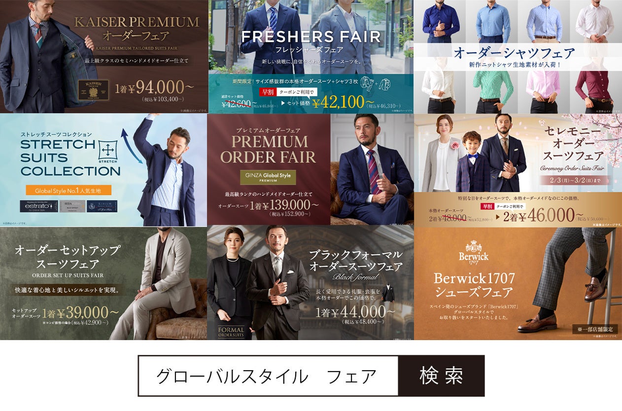 【新店OPEN記念】「グローバルスタイル」は新店OPENを記念し、オーダースーツが2着¥46,000~(税込¥50,600~)のお得なフェアを2月3日~3月2日まで全店舗で開催!