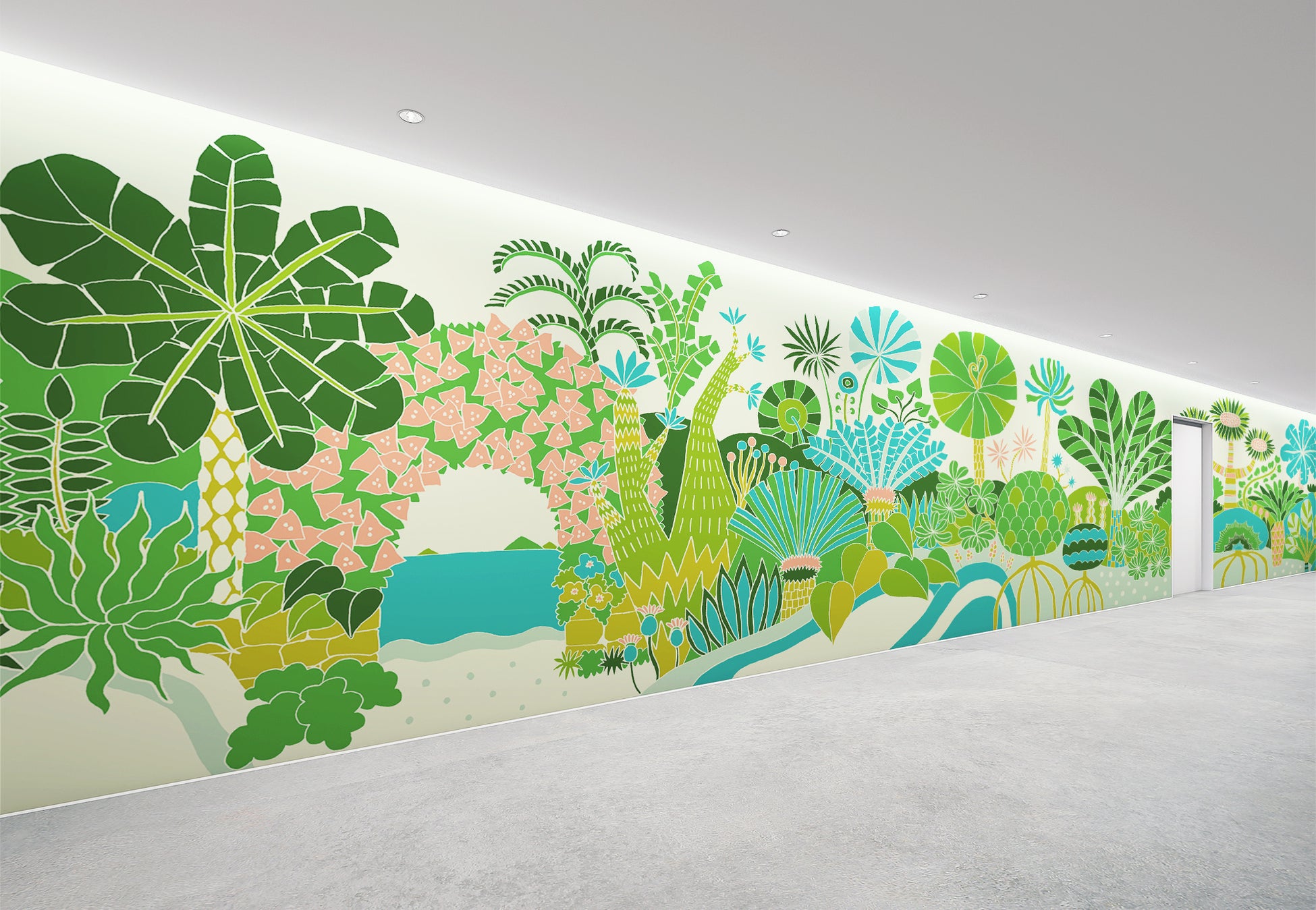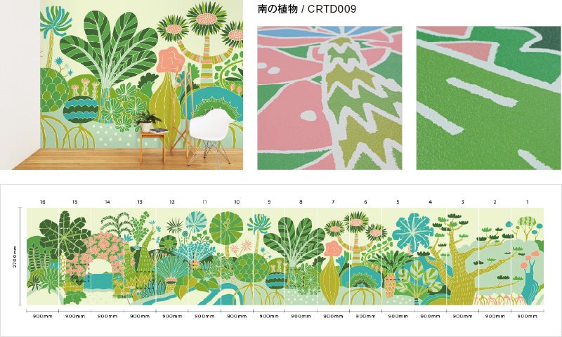 壁紙ブランド「WhO(フー)」、炭酸デザイン室による旅先のモチーフを描いた新柄。全長約14mに渡って生い茂る南国のおおらかな植物たち