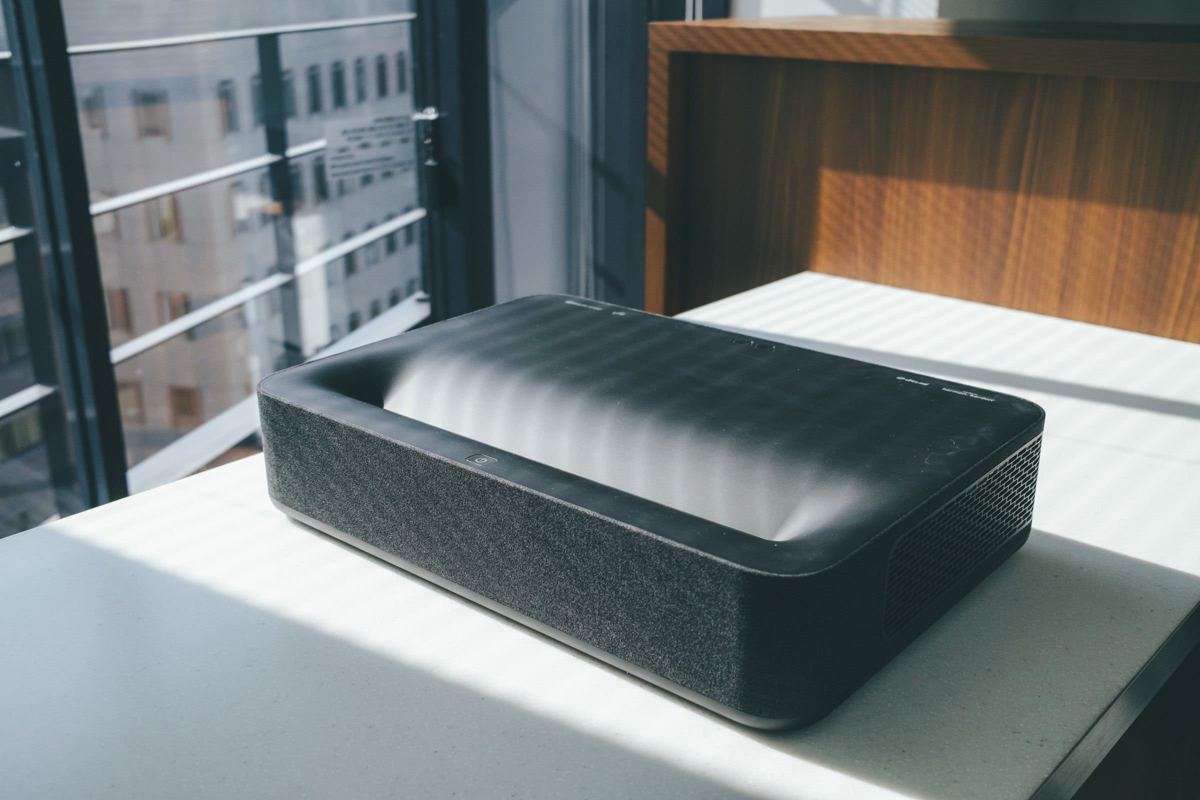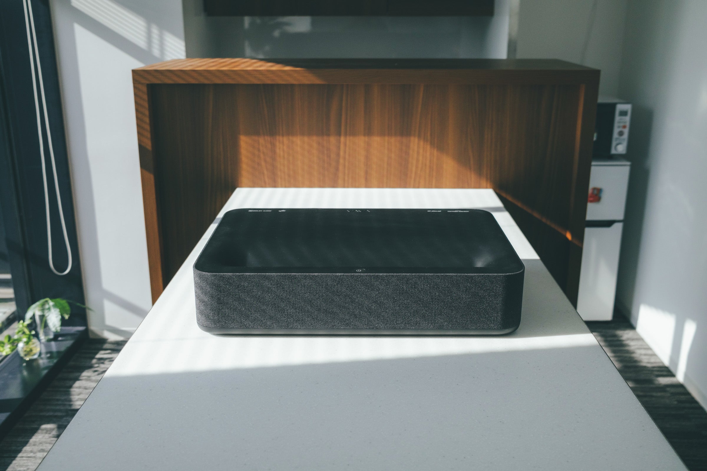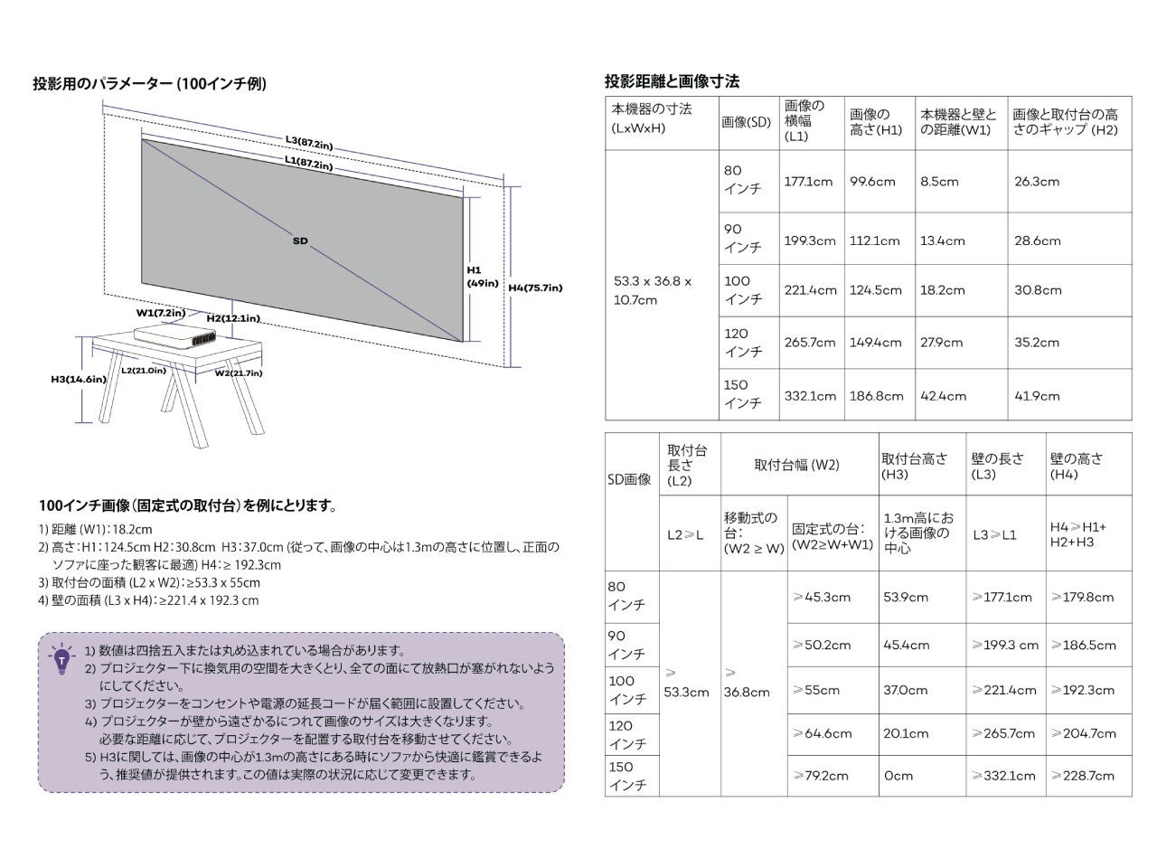 従来のプロジェクターと異なり、"0.233:1"の超短焦点仕様を実現。その仕様は例えば壁からわずか18cmほどの距離で 100インチの映像が投影できるほど。設置場所から投影⾯までの距離を確保する必要がなく、⼀般的な住宅環境でもまるで映画館のような映像体験をお楽しみいただけます。