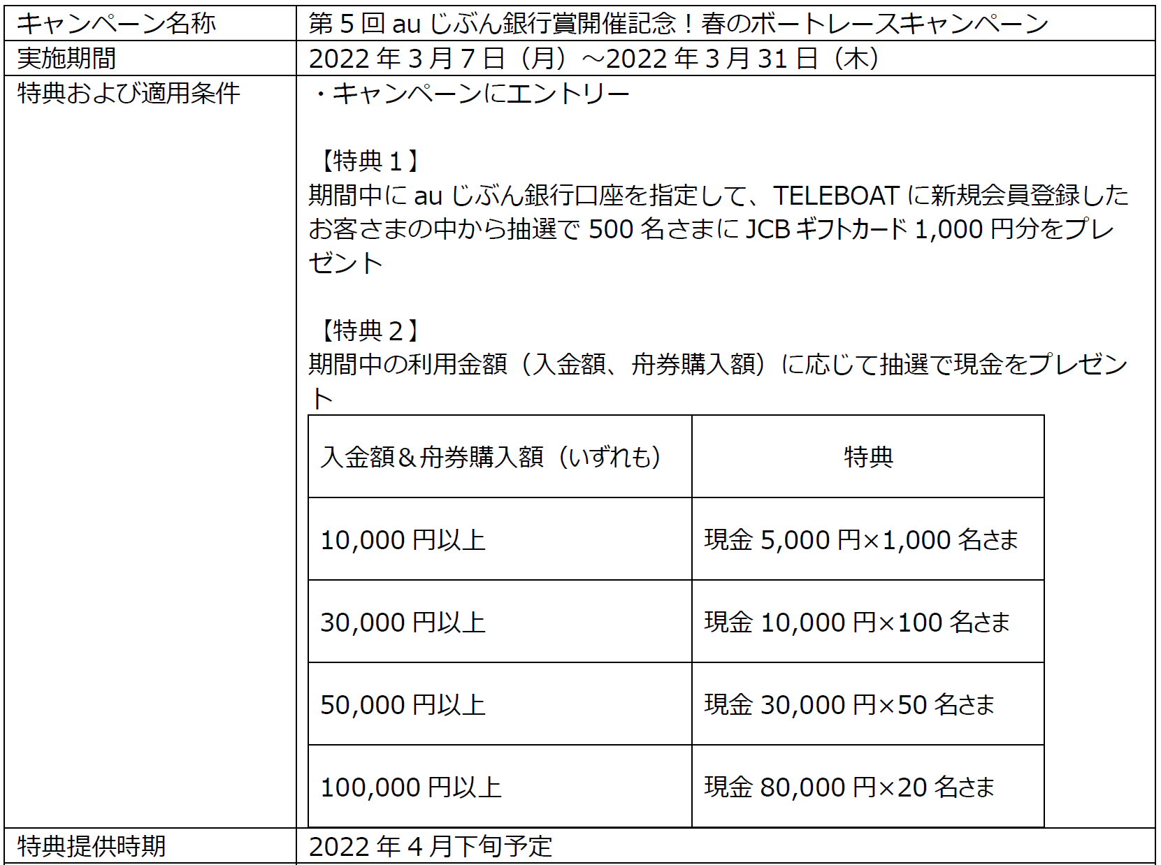 本キャンペーンでは、キャンペーン期間中にauじぶん銀行口座から「TELEBOAT」へ入金、舟券をご購入いただいたお客さまを対象に、ご購入金額に応じて、抽選で現金最大80,000円をプレゼントします。また、キャンペーン期間中にauじぶん銀行口座を指定して「TELEBOAT」に新規会員登録されたお客さまを対象に、抽選でJCBギフトカード1,000円分をプレゼントします。本キャンペーンをきっかけとして、さらに多くのお客さまのボートレースへの参加を期待しています。