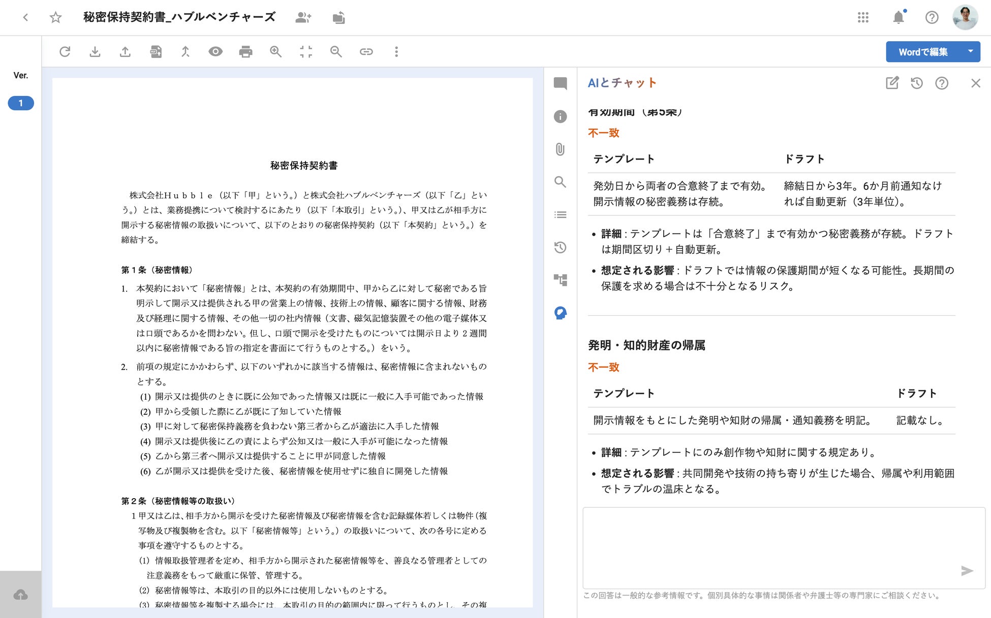 第1弾となる今回は、これまでβ版としてご提供していた「自社ひな形やプレイブックに基づく対話型レビュー支援機能」を正式に実装しました。CFAが契約審査をリアルタイムで支援し、属人的になりがちなレビュー業務の精度と再現性を高めます。