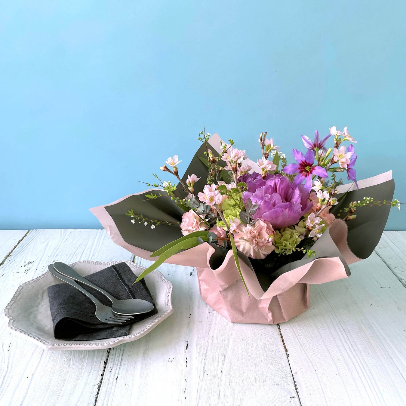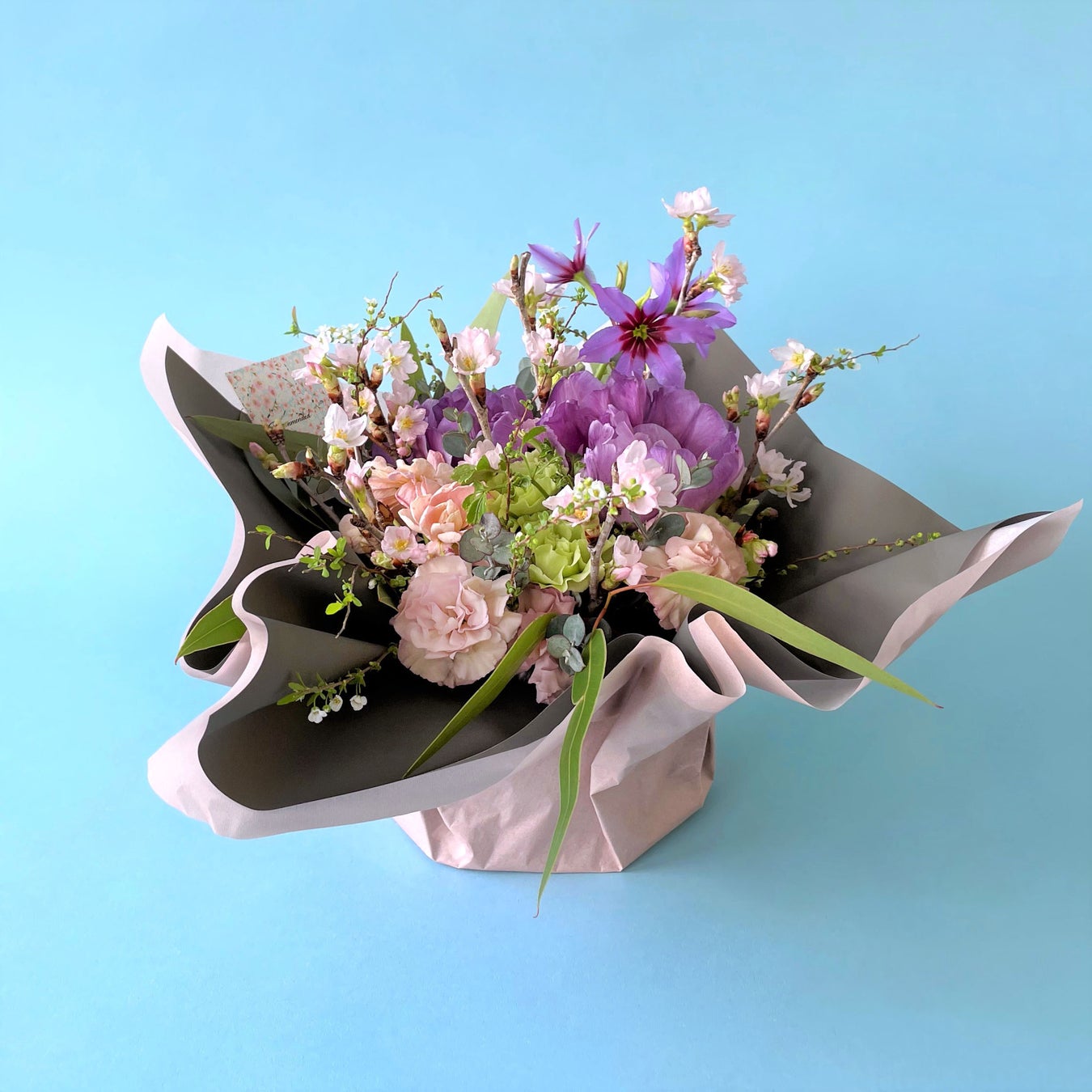 桜と季節の花々を程よいボリュームのブーケに仕上げました。送別や卒業、合格など特別な贈り物にもおすすめです。