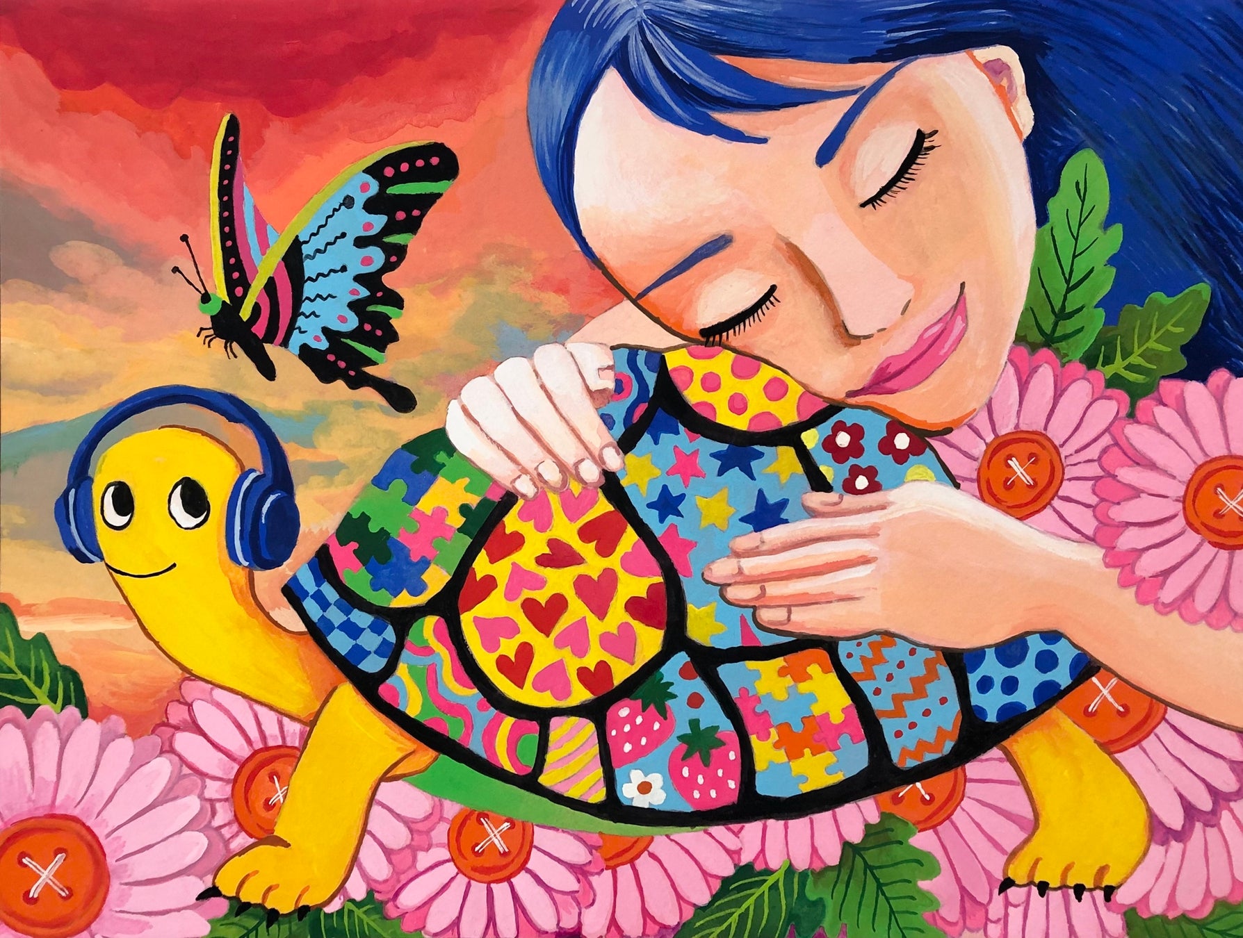 遅い自分をカメで表現し、そんなカメに「ありがとう」と寄り添っている女性を描きました。