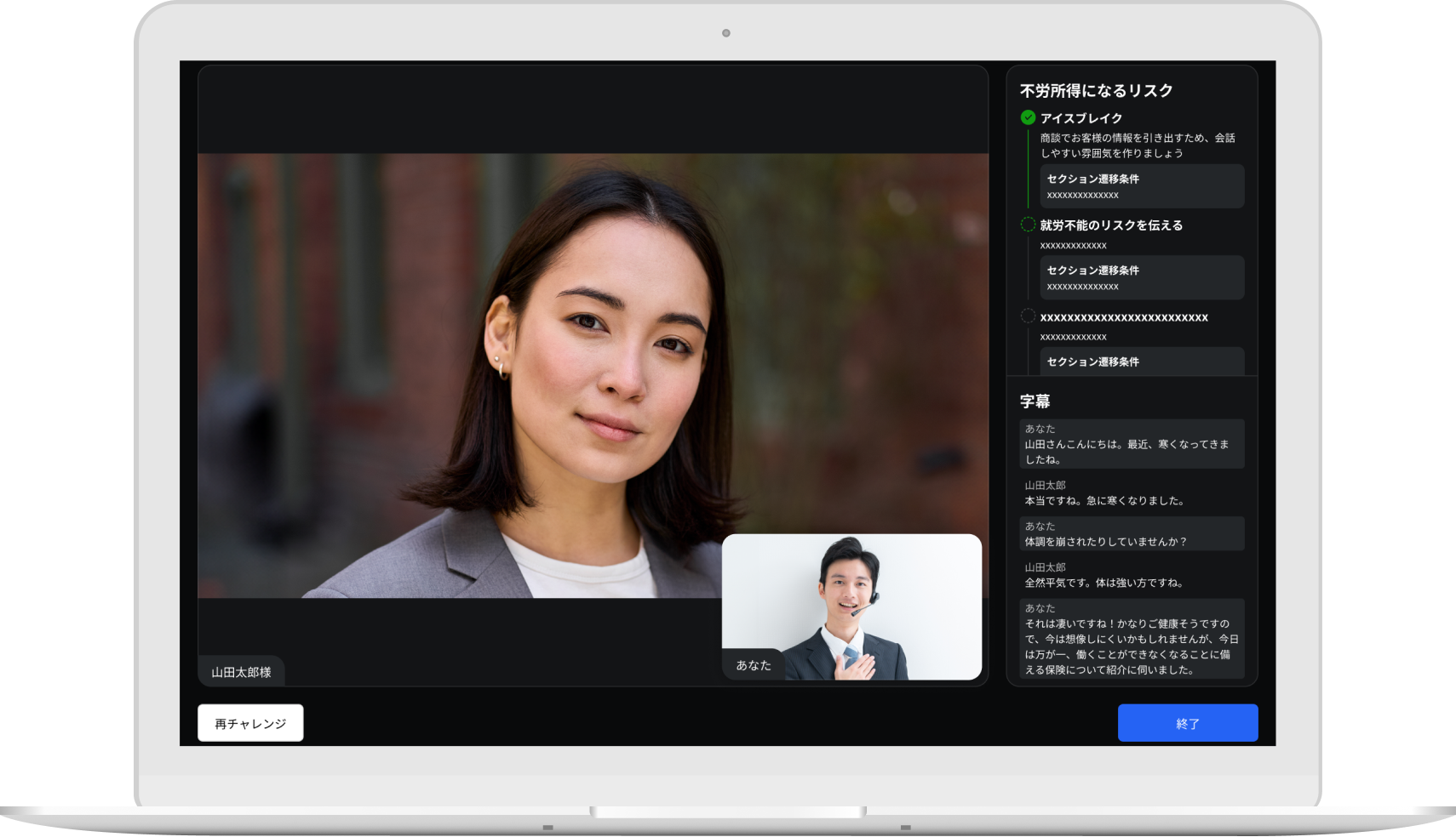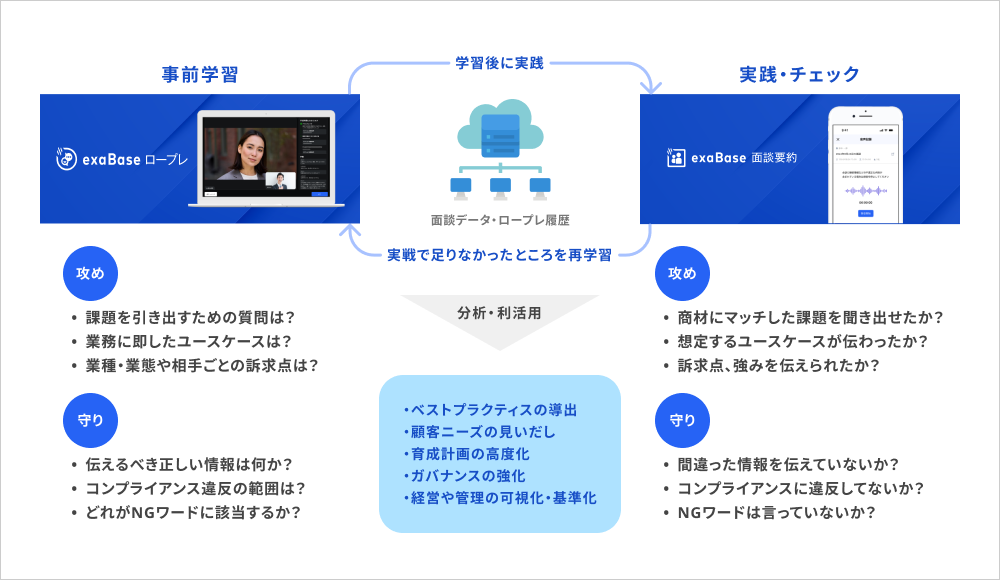 exaBase ロープレとexaBase 面談要約を利用いただくことで、ロールプレイングで事前に学んだ内容を顧客との面談で実践できているのかを確認できます。また、実践できなかった内容を、ロールプレイングでの練習に組み込むことができます。