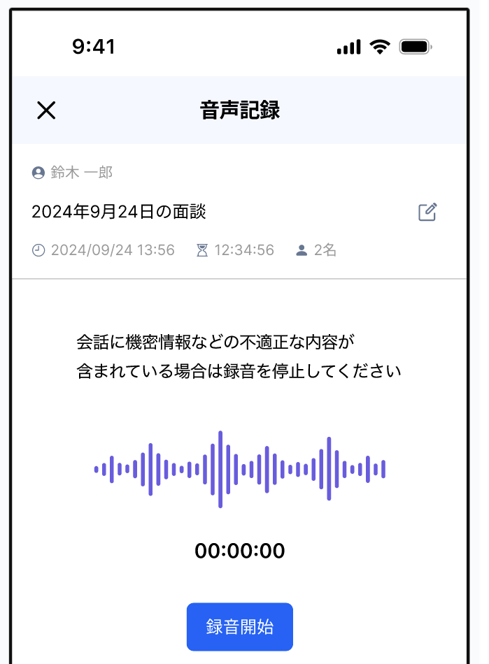 営業や接客を実際に現場でどのように実施しているのかを、AIによって文字起こしして分析する「exaBase 面談要約」を2024年12月に提供開始します(右はスマートフォン画面例。PCでの録音、管理も可能)。