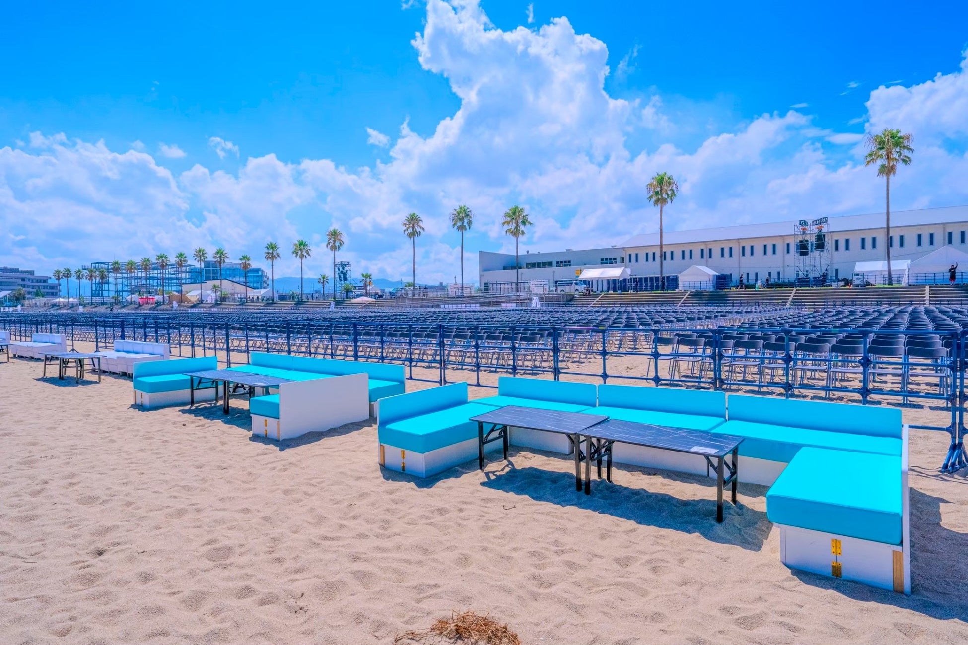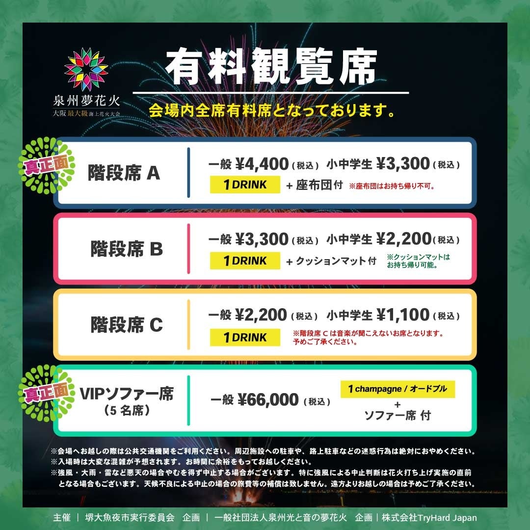 泉州夢花火in堺大魚夜市は全席先着順の自由席となっております。場合によっては団体様であっても離れてお座り頂く可能性がございますので、早めのご来場を推奨いたします。