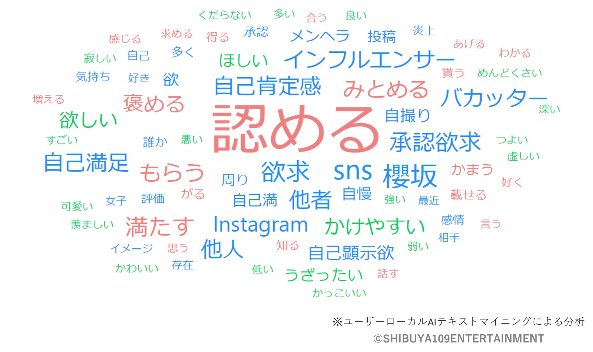さらに承認欲求について聞いた際、フリー回答をテキストマイニング※図2したところ、InstagramやインフルエンサーといったSNSに関連する語句に加え、「バカッター」「メンヘラ」などマイナスな印象を表現する言葉も多く見られました。 Z世代の承認欲求とSNSには密接な関係性があることがうかがえます。