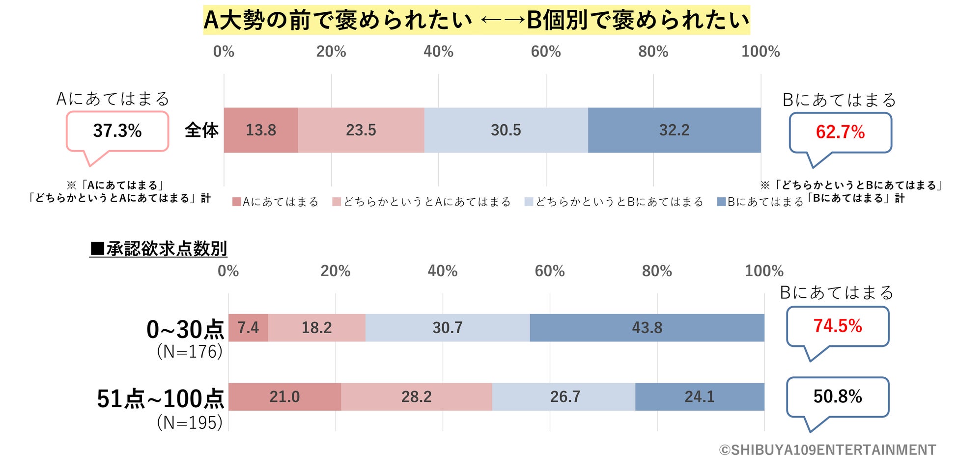 求めている褒められ方※図9としては、「大勢の前よりも、個別で褒められたい」という回答が62.7%になっています。この傾向は、承認欲求の点数の平均点(40点台)を基準に承認欲求度が低い(30点以下)グループで特に顕著で、承認欲求度が高い(51点以上)グループでは半数程度なのに対し、30点以下のグループでは、7割以上になっています。