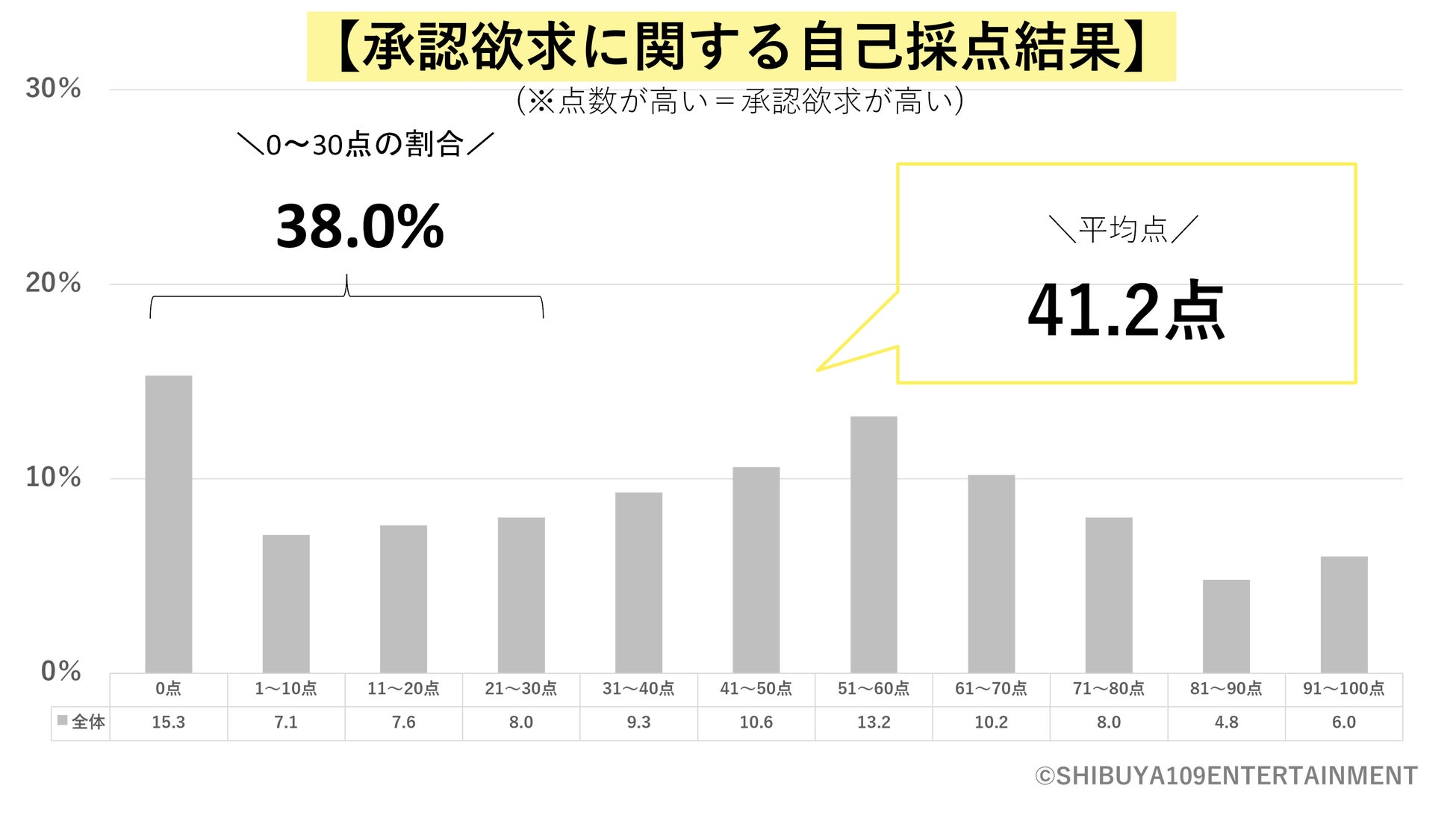 Z世代の承認欲求について調査するにあたり、自分の「承認欲求」を100点満点で採点してもらった結果※図1、平均は41.2点と50点を超えておらず、30点以下をつけた人数の割合は38.0%となりました。