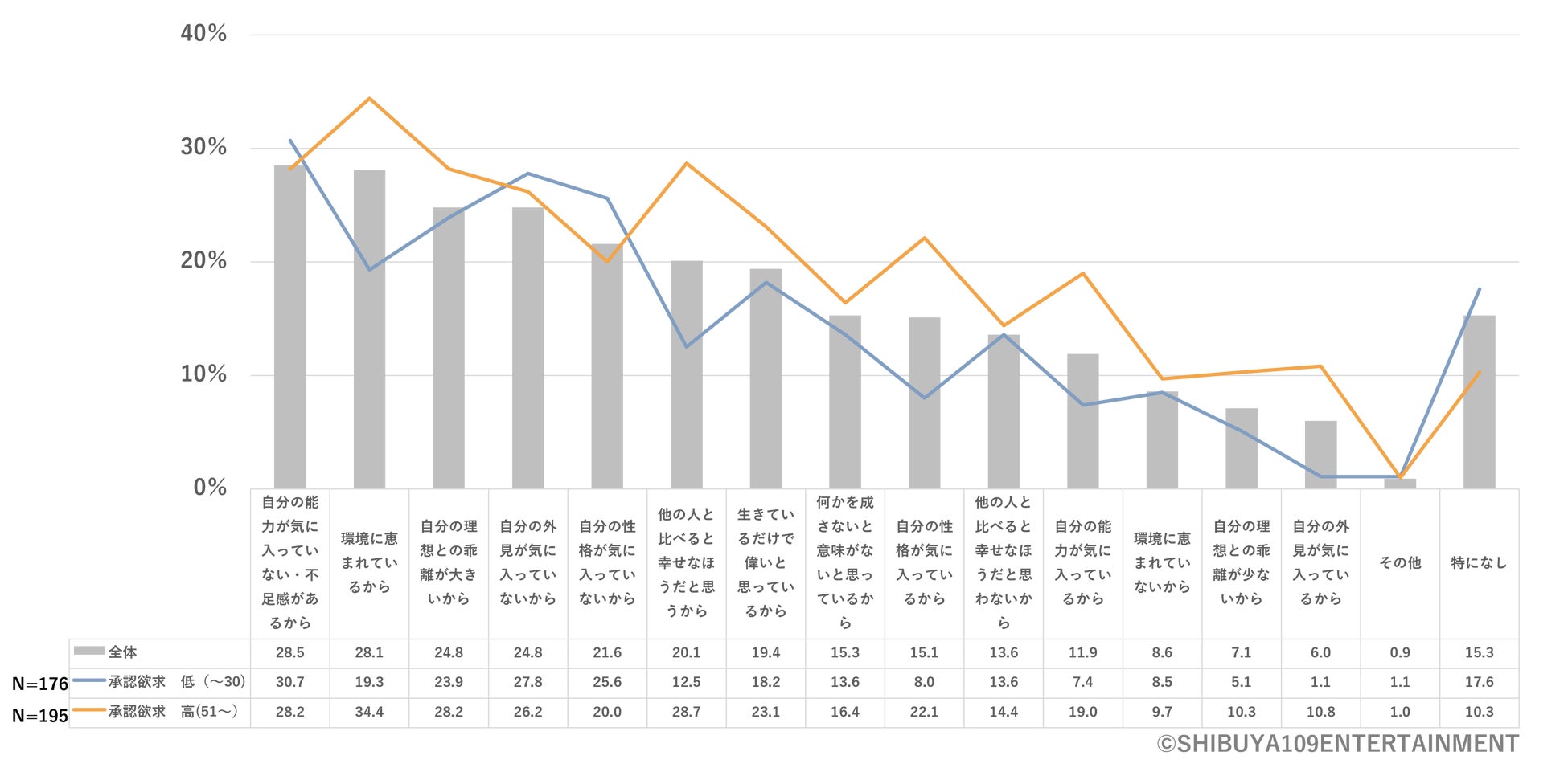 ここまで他者からの見られ方や評価について聞いてきたため、最後に自分自身に対する見方や評価を確認するために「自分への満足度」について聞いてみました。自分への満足度への理由※図14をプラス因子とマイナス因子を同時に聞き、グループごとにみてみると、承認欲求が高いグループは、「環境に恵まれているから(28.1%)」「ほかの人と比べると幸せな方だと思うから(28.7%)」など他者起因の理由が高く、承認欲求が低いグループは「自分の能力が気に入っていない・不足感があるから(28.5%)」「自分の外見が気に入っていないから(27.8%)」など自分起因の理由が高くなっているのが特徴です。悪い面は自分自身に、良い面は周りの環境に要因があると考えていることがわかりました。