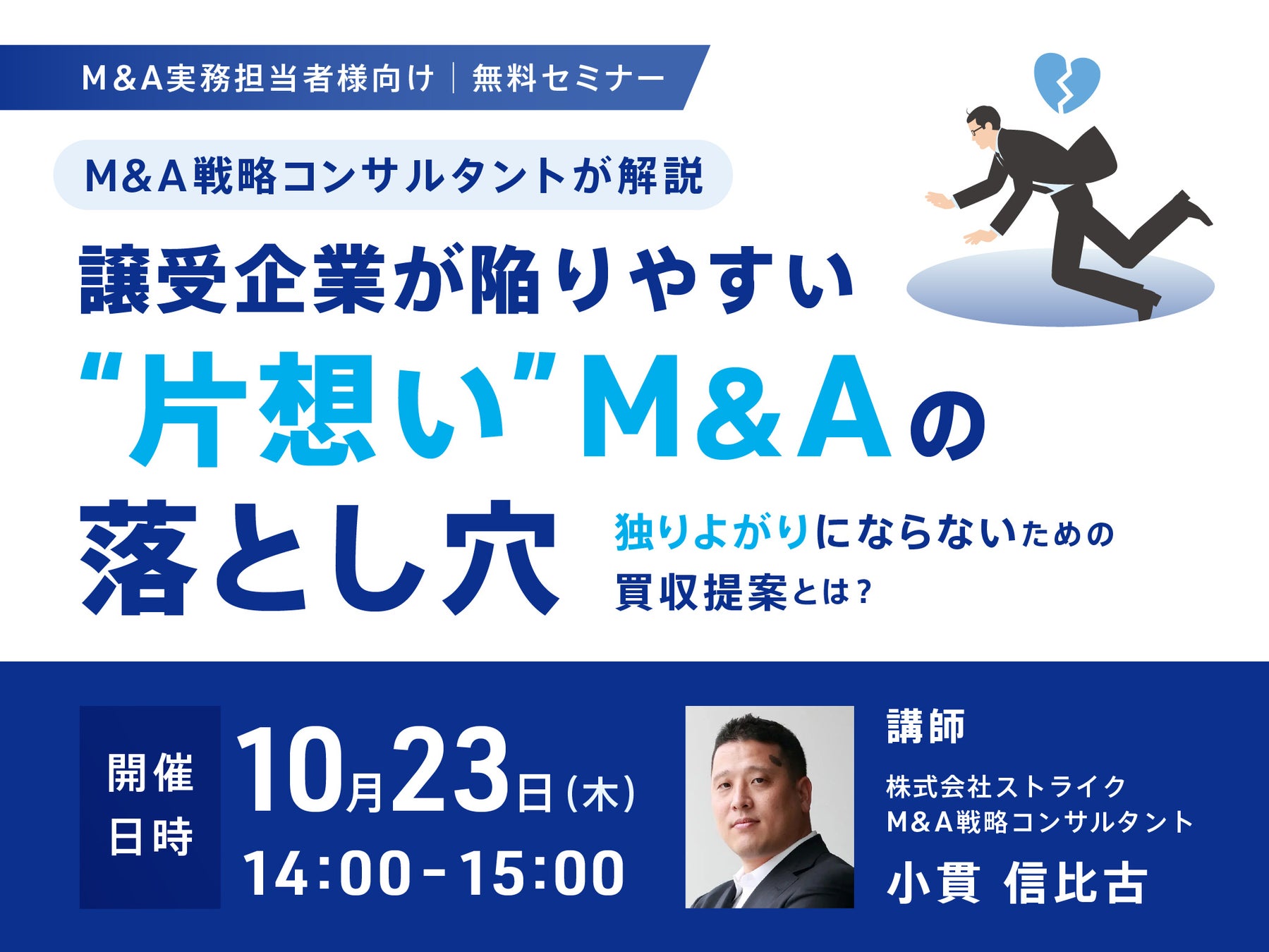 M&A仲介の株式会社ストライク(本社:東京都千代田区、代表取締役社長:荒井邦彦 以下「ストライク」)は、M&A実務担当者を対象に、無料セミナー「譲受企業が陥りやすい “片想い”M&Aの落とし穴」を2025年10月23日(木)に開催します。