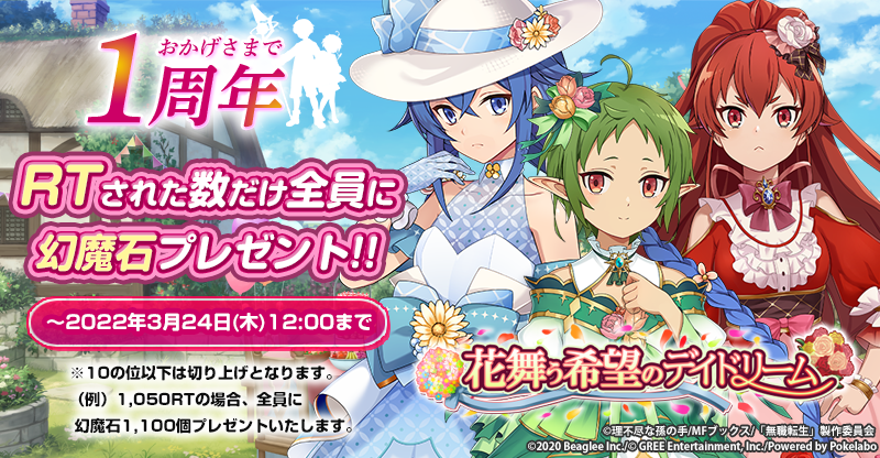 『無職転生~ゲームになっても本気だす~』の公式Twitterアカウントにて指定ツイートがRTされた数だけ、全員に幻魔石をプレゼントいたします。RT数が多ければ多いほどユーザーへ付与される幻魔石の数が増えるので、是非ご参加ください。