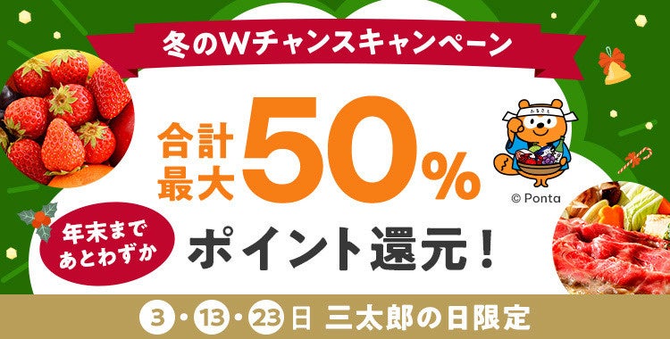 実施中のキャンペーンや特典とあわせると合計最大47%のポイント還元、さらに三太郎の日(2024年12月3日、13日、23日)やポイント超超祭(2024年12月5日から10日)なら合計最大50%のポイント還元となるチャンスがあります。