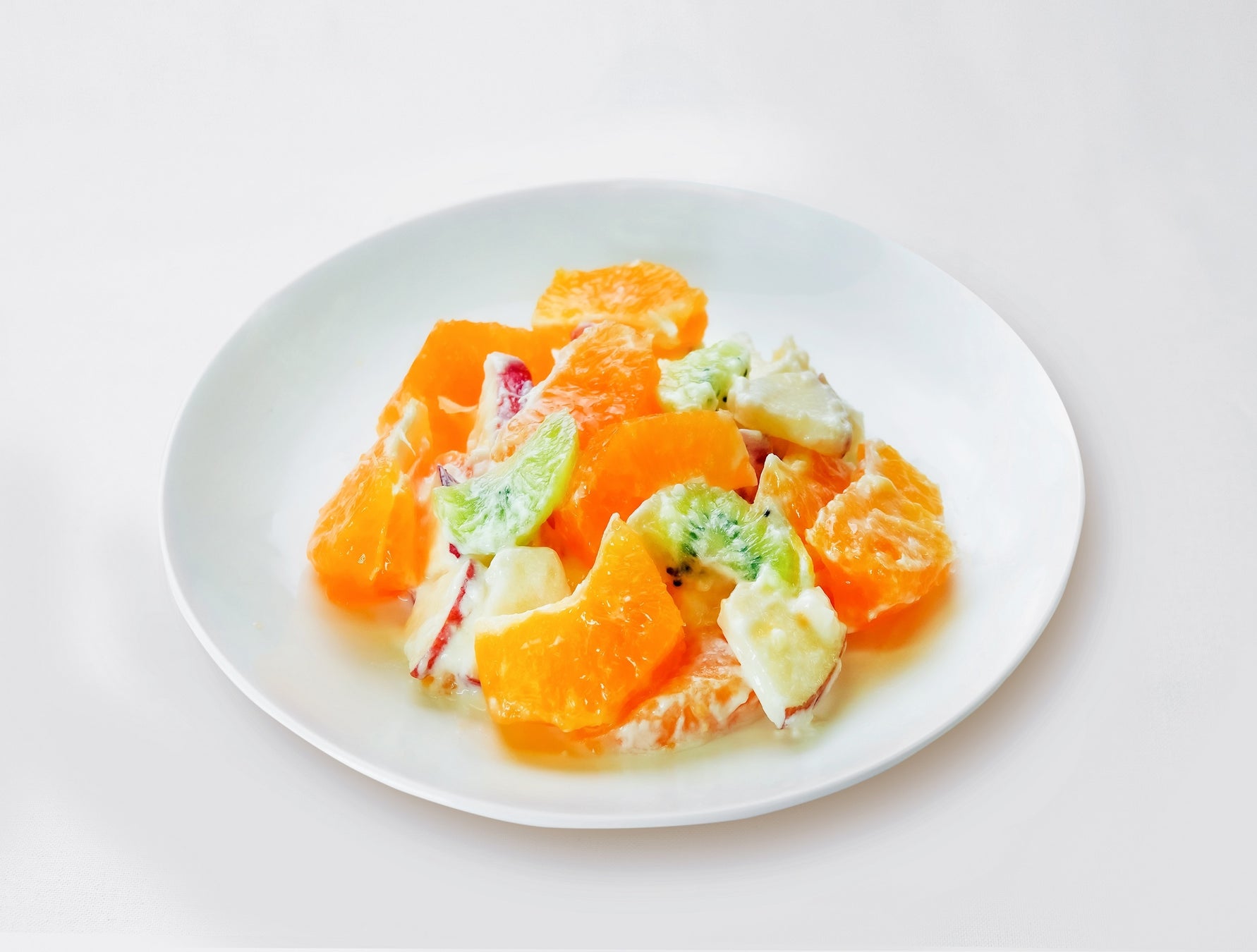 4種類のフルーツとマイルドな甘さの練乳ソースをからめたサラダにデコポンをトッピングしました。
