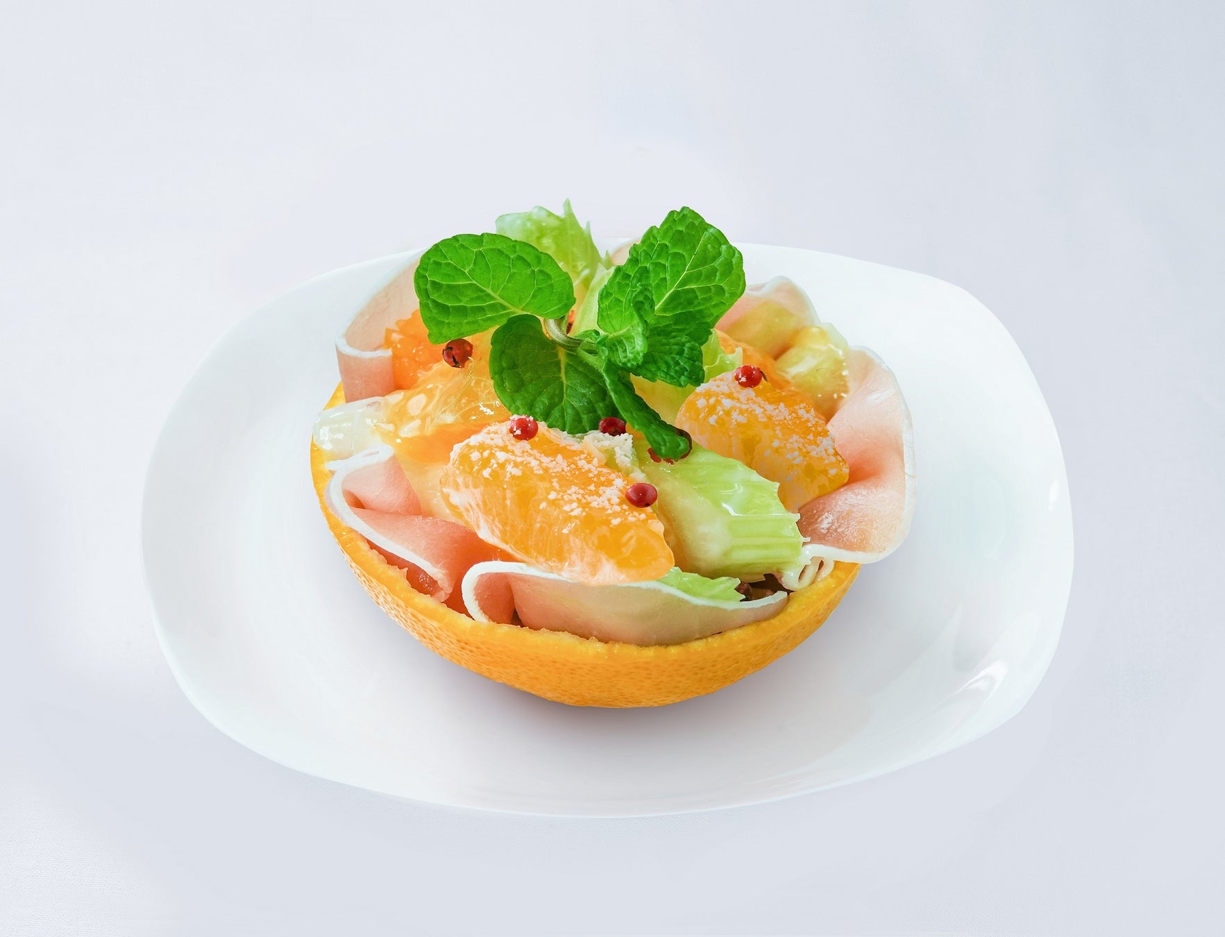デコポンの果実とセロリをコールスロードレッシングで和えてデコポンの皮の器に盛りつけました。ピンクペッパーとパルメザンチーズがアクセントになっています。