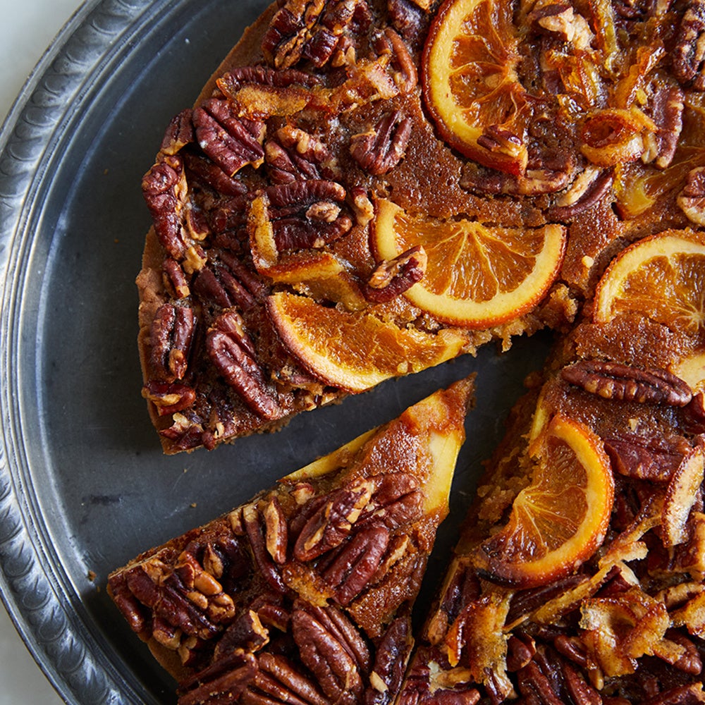 ナッツをたっぷりと載せたタルト。キャラメル味のアーモンドクリームが敷き込まれ、コク深く、リッチな味わい。大きく食べ応えのあるサイズながらも、フルーツの酸味、グランマニエの香りがアクセントになり、最後まで飽きることなくたのしめます。