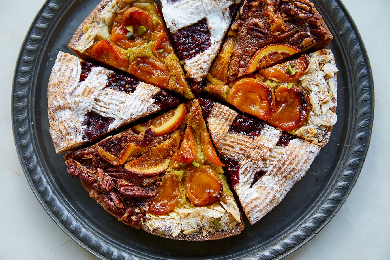 見た目も華やかで、味わいや風味のバリエーションが豊富なタルト。タルト生地にアーモンドクリームを重ね、ナッツやフルーツなどをバランスよくトッピングして焼き込みました。自由な発想でつくられた、季節の3種類のタルトをおたのしみください。