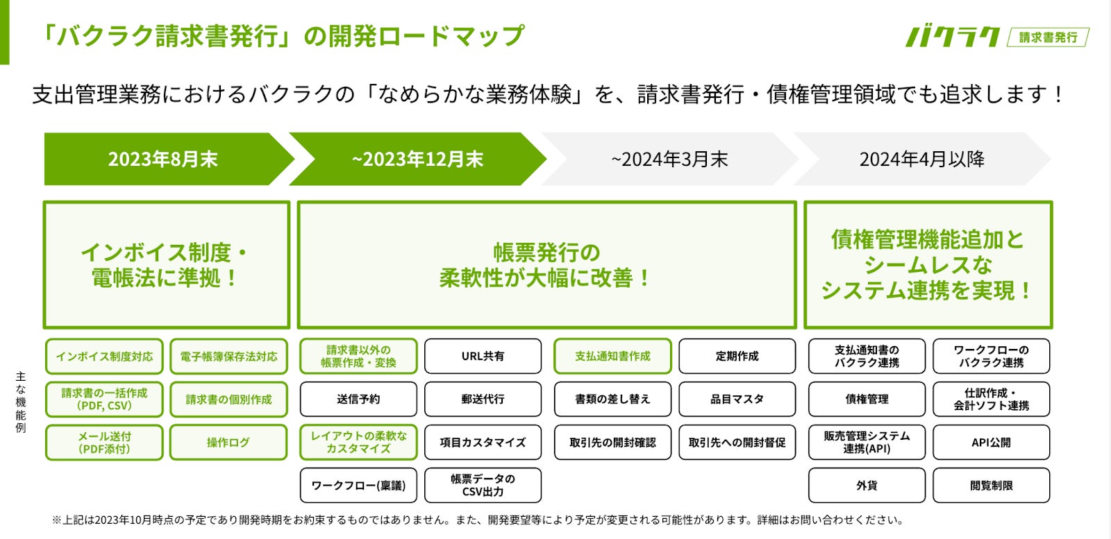 バクラク請求書発行は、インボイス制度や電子帳簿保存法の要件を満たしてあらゆる帳票を作成・送付・保存できるプロダクトです。2023年8月の正式リリースに合わせ、開発ロードマップを公開しています。今後も、さまざまなアップデートを予定しています。