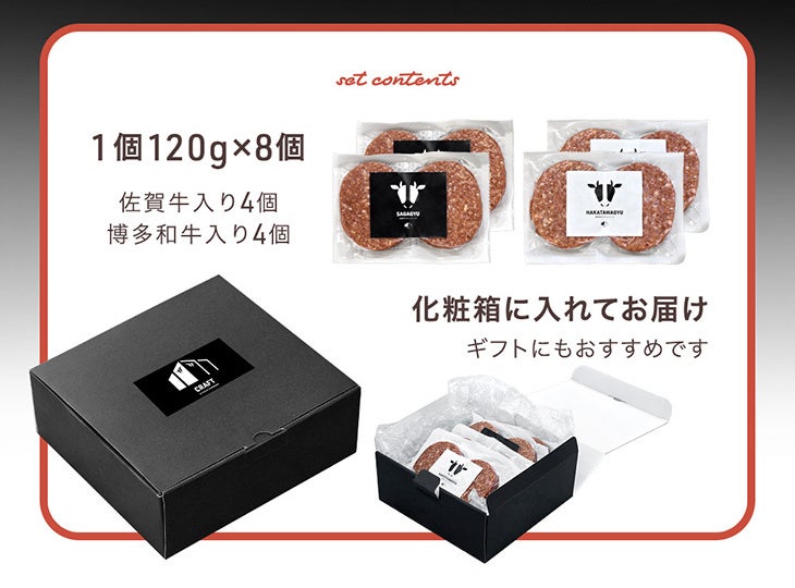 今回発売される「博多和牛と佐賀牛のハンバーグ食べ比べセット CRAFT」は、博多牛入りのハンバーグが4個と佐賀牛入りのハンバーグが4個入りの計8個のハンバーグをクール便でお届けいたします。