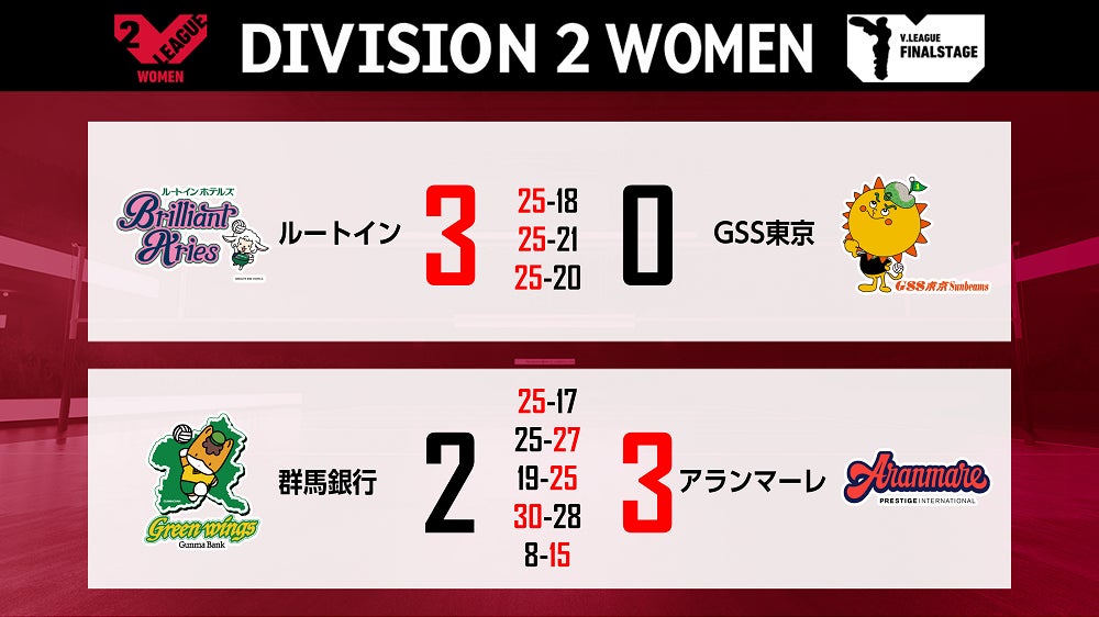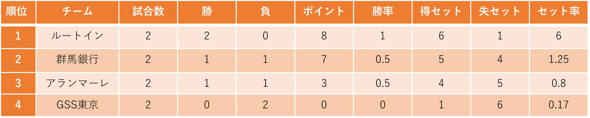 V・ファイナルステージ2日目終了現時点では、1位ルートイン(2勝0敗、8pts)、2位群馬銀行(1勝1敗、7pts)、3位アランマーレ(1勝1敗、3pts)、4位GSS東京(0勝2敗、0pt)の順位となっています。今週日曜日に残すのは、現在1位のルートインと2位の群馬銀行、3位のアランマーレと4位のGSS東京の対戦です。