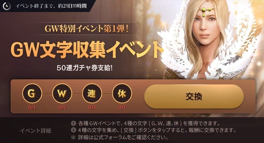 「G」「W」「連」「休」の文字を集めて、「<EV>陽春の冒険ガチャ10回券」5個が手に入る、文字収集イベントが開催。各文字は他に開催されているGWイベントで獲得する事ができます。