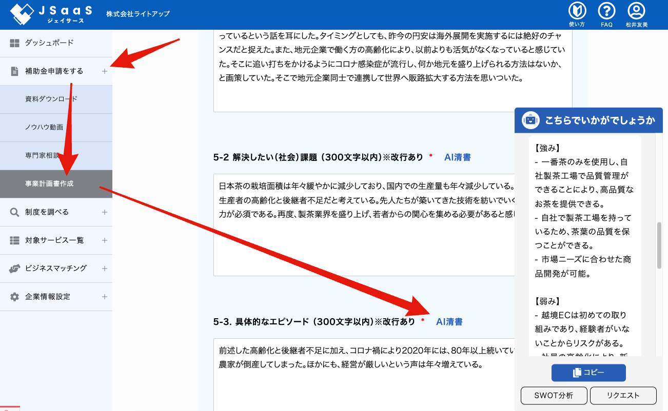新設した【事業計画書作成コーナー】において、AIボタンをチェックすることで【入力した文章の清書・誤字脱字修正】や【SWOT分析の自動生成】などをChatGPTを活用し作成することが可能です。