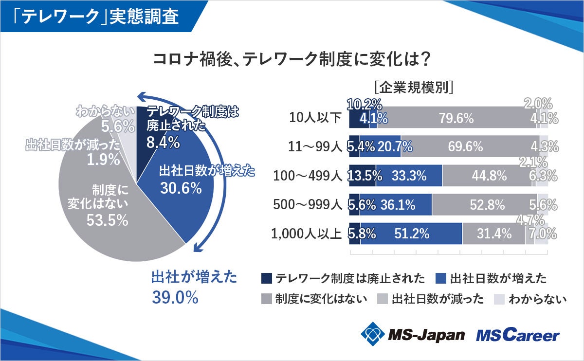 ・コロナ後に出社が増えた企業は4割。1割の企業ではテレワーク「廃止」
