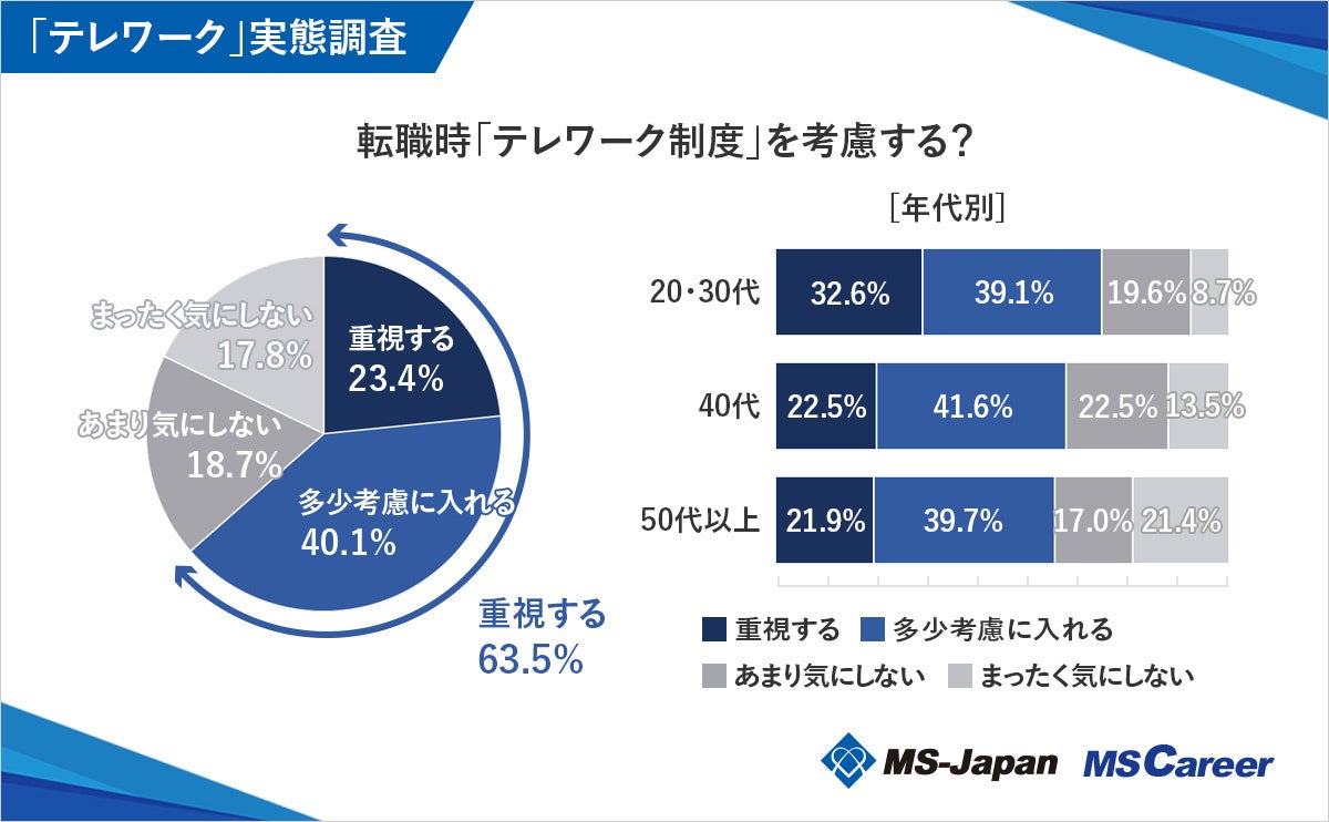 また、転職時に「6割」の人が、テレワーク制度を重視することも明らかに。特に若い世代ほど重視する傾向は強まり、50代以上でも6割が、20・30代では7割が重視していることがわかりました。