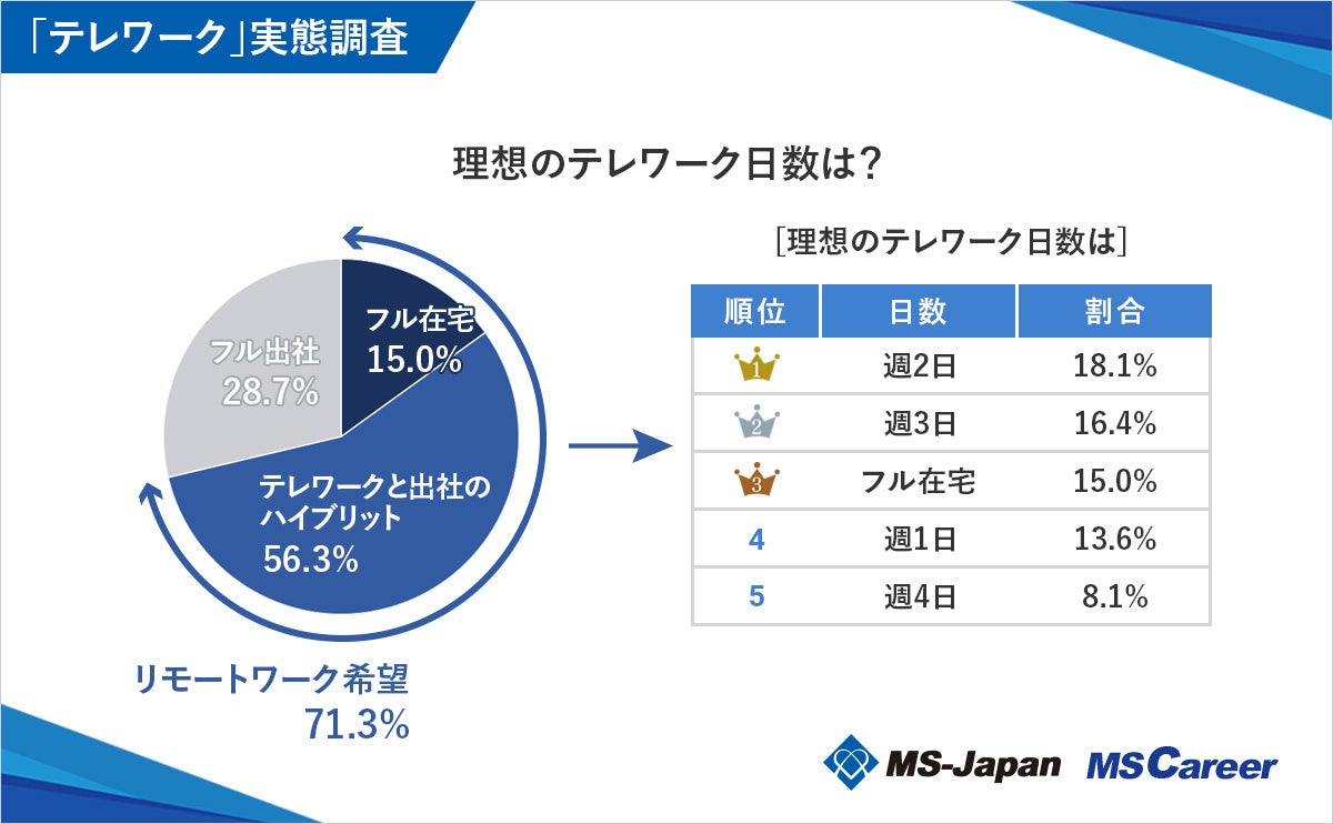 理想のテレワーク頻度は、1位「週2日テレワーク(18.1%)」、2位「週3日テレワーク(16.4%)」、3位「フル在宅(15.0%)」という結果となりました。