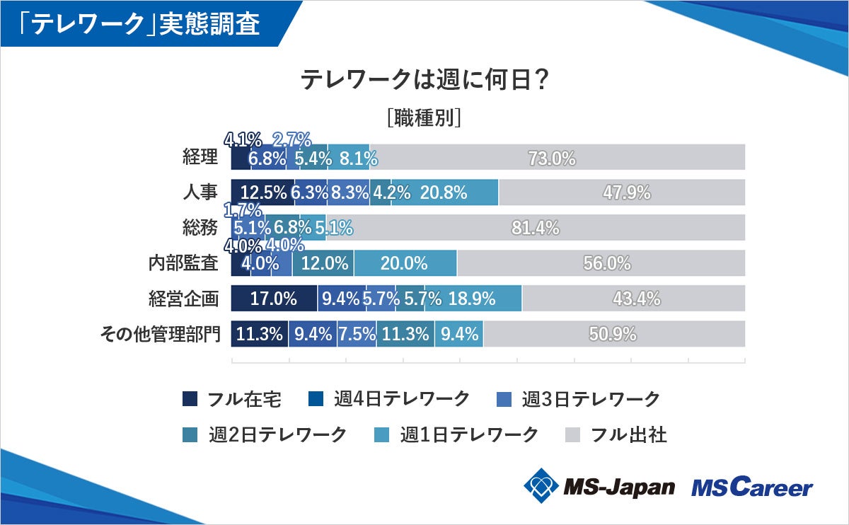 また、職種によっても差がみられ、管理部門職種では「経理」と「総務」が特にテレワーク実施率が低いことが明らかになりました。