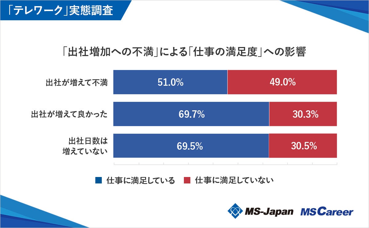 さらに、出社日数増加への不満度が上がるほど、仕事への満足度が下がることも明らかに。出社増にポジティブな層は、仕事に不満を感じている人が約3割にとどまる一方で、出社増に不満な層では「5割」と、仕事に不満を感じている人が1.6倍に増加する結果となりました。