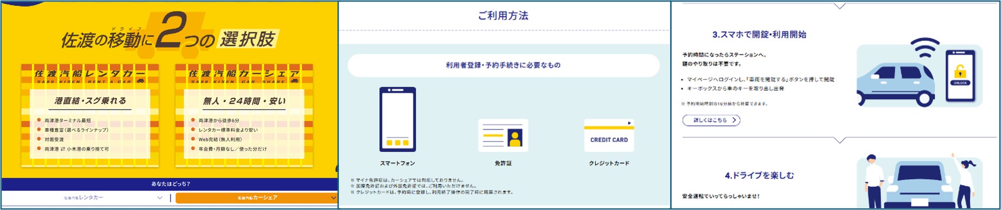 新予約サイトでは、「レンタカー」または「カーシェア」を、ひとつの画面の中で用途やお好みにあわせて選択可能です。直感的なUIでスムーズな予約手続きにより、佐渡到着前からストレスなく移動計画を立てることが可能になります。