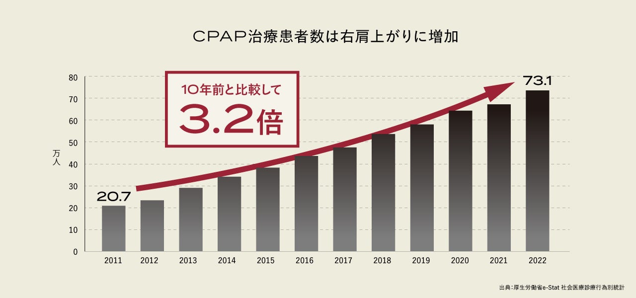 SASとは、睡眠中に10秒以上呼吸が止まる「無呼吸」や弱い呼吸「低呼吸」が多く発生する睡眠障害です。呼吸が停止する状態が繰り返し発生することで血液中の酸素濃度が低下し、様々な症状や合併症を引き起こす恐れがある疾患です。10秒間以上呼吸が停止する状態が、1時間あたり5回以上あれば、SASと診断されます。日本におけるSASの潜在患者数は2,200万人、治療が必要な患者数は940万人と推定され、年々増加傾向にあります。※2 また、SASの治療法として一般的とされるCPAP※3を用いた治療を行っている患者数は、10年間で3.2倍に増加しています。※4 SASは糖尿病・高血圧・脳血管疾患など様々な合併症を引き起こし、中等症以上で未治療の場合8年後の死亡リスクが40%近くもある恐ろしい疾患です。※5