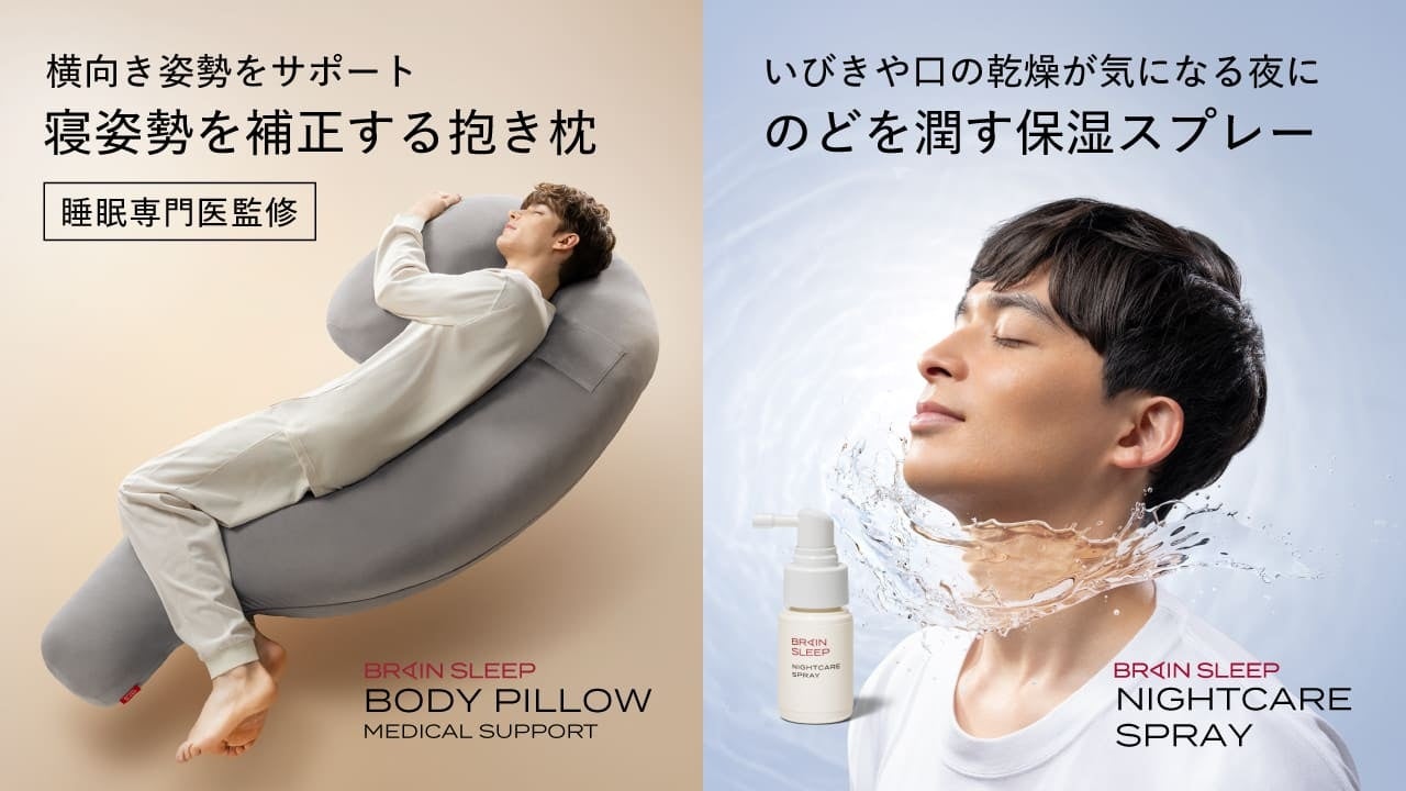 株式会社ブレインスリープ(本社:東京都千代田区、代表取締役:廣田 敦、以下「ブレインスリープ」)は、睡眠時のいびき対策としていびきによるのどの乾燥をケアする「ブレインスリープ ナイトケア スプレー(以下、「ナイトケア スプレー」)」と、いびきを軽減する横向き寝姿勢をサポートする睡眠専門医監修の抱き枕「ブレインスリープ ボディピロー メディカル サポート(以下、「ボディピロー」)」を4月8日(水)11時よりブレインスリープ オフィシャルサイトにて発売します。いびきは睡眠の質を低下させる要因であり、 また、睡眠時無呼吸症候群(Sleep Apnea Syndrome、以下「SAS」)の主な症状のひとつとも言われています。今回、いびきサポートに特化した2つのプロダクトを通じて、いびきやSASのケアに自宅でも取り組める環境づくりを目指します。