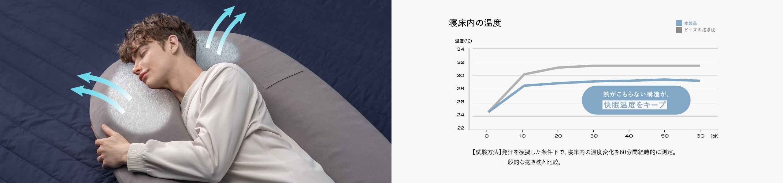 通気性に優れた本体と、さらっとした風合いと抜群の吸水拡散性に優れたレーヨン混素材のカバーの相乗効果でさらに蒸れ感を軽減。朝まで最適に温度・湿度をコントロールします。一般的なウレタン素材の抱き枕は通気性が悪く湿気や熱が溜まりやすいですが、「ボディピロー」は90%以上が空気でできているためダニやカビが発生しにくく清潔で、中材までシャワーで水洗い可能です。