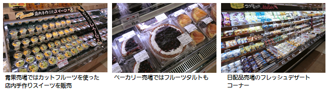 また、デザート類も品揃えが充実。青果売場の「フレッシュサラダ&カットフルーツ」コーナーでは「フルーツ杏仁」を、ベーカリー売場の冷蔵ケースでは「フルーツタルト」を作り立てで販売します。さらに、新しくなった日配品売場ではフレッシュデザートの種類を増やし、選ぶ楽しみがあるコーナーを実現させました。