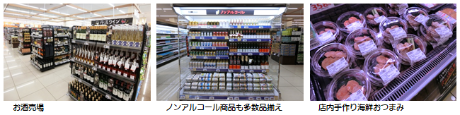 お酒売場では、ビールや缶チューハイ、ワインの売場を広げ、ご当地商品や特徴ある商品、ノンアルコールの商品も豊富に品揃えします。お酒に合うおつまみとして、鮮魚売場では「店内手作り海鮮おつまみ」、総菜売場では「リンゴ酢で仕上げたキャロットラぺ」や「5種のきのことオリーブのマリネ」などの洋風サラダも販売しています。