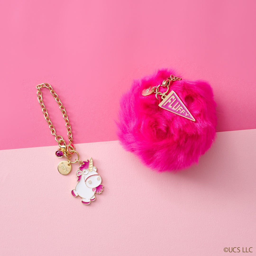 ユニコーンのぬいぐるみ「フラッフィ」のアートをそのまま金具に落とし込んだデザインと、「フラッフィ」のふわふわをイメージしたファーデザインの
