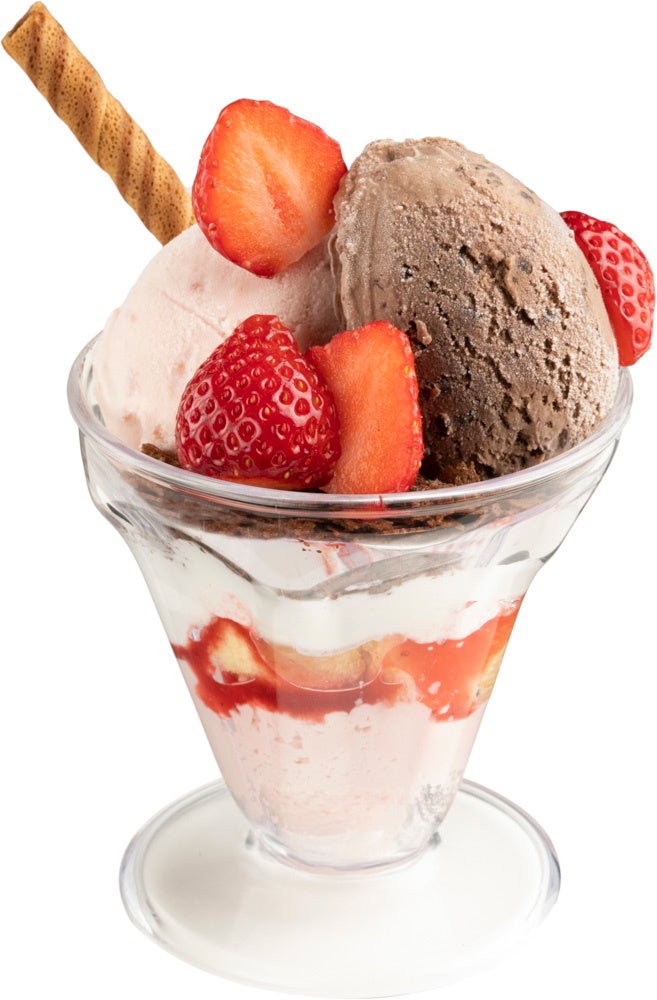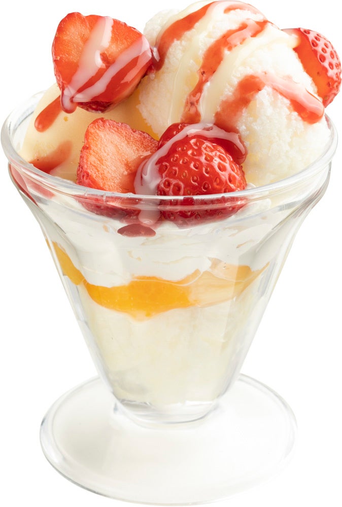 練乳をたっぷり使ったグラニタ(味付きかき氷)をベースに、ミックスフルーツやホイップクリーム、練乳をトッピングした白くまパフェ。今回は春らしくフレッシュいちごをのせて、いちごソースと練乳をかけ、バニラアイスもトッピングしています。