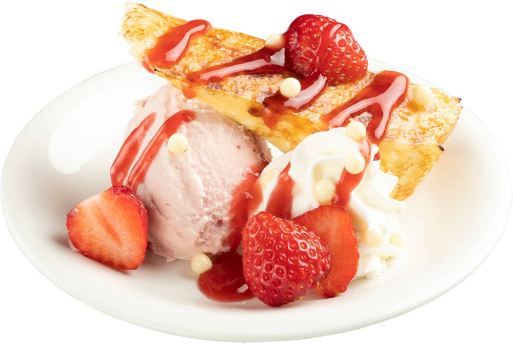 人気スイーツ「ミルクレープ」の春バージョンが登場!ミルクレープは注文ごとに表面をブリュレして、香ばしさとパリパリ食感をプラス。いちごアイスとホイップクリームに、たっぷりのフレッシュ苺をトッピングしています。くちどけのよいミルクレープのキャラメリゼの香り、ひんやりとしたいちごアイスとホイップのなめらかな食感、苺の爽やかな酸味と香り、それらが折り重なり生まれる春をお口の中でお楽しみください。