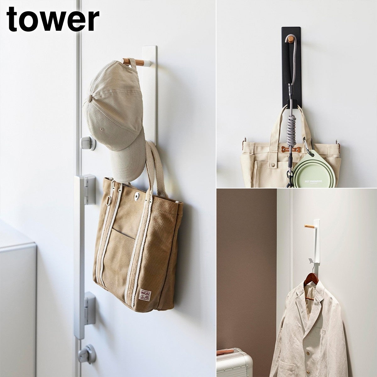マグネットのつく玄関扉に設置するだけで、上着や帽子はもちろん、毎日使う犬のお散歩グッズもまとめて掛けておけるハンガーフックです。
