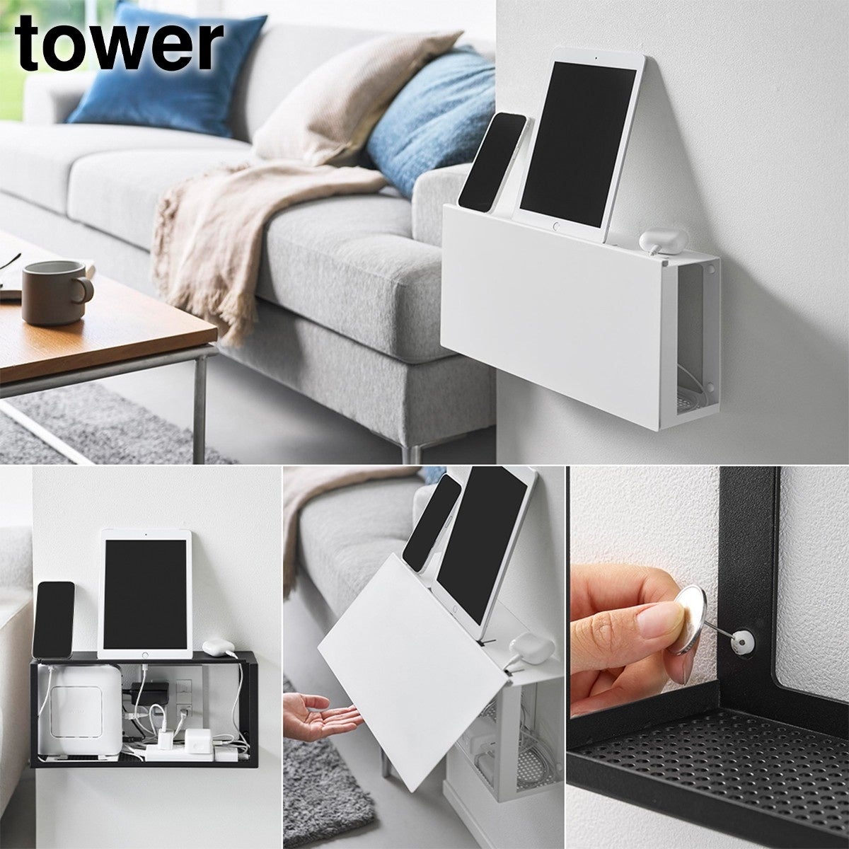 置き場所に困るルーターやケーブルを、コンセントごと目隠しできる壁付けラックです。