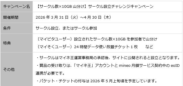 株式会社オプテージ(大阪市中央区)は、携帯電話サービス「mineo(マイネオ)」のコミュニティサイト「マイネ王」において、ユーザー同士が共通の興味や関心を軸に、継続的に交流できる新機能「サークル」を2026年3月31日(火)に導入します。