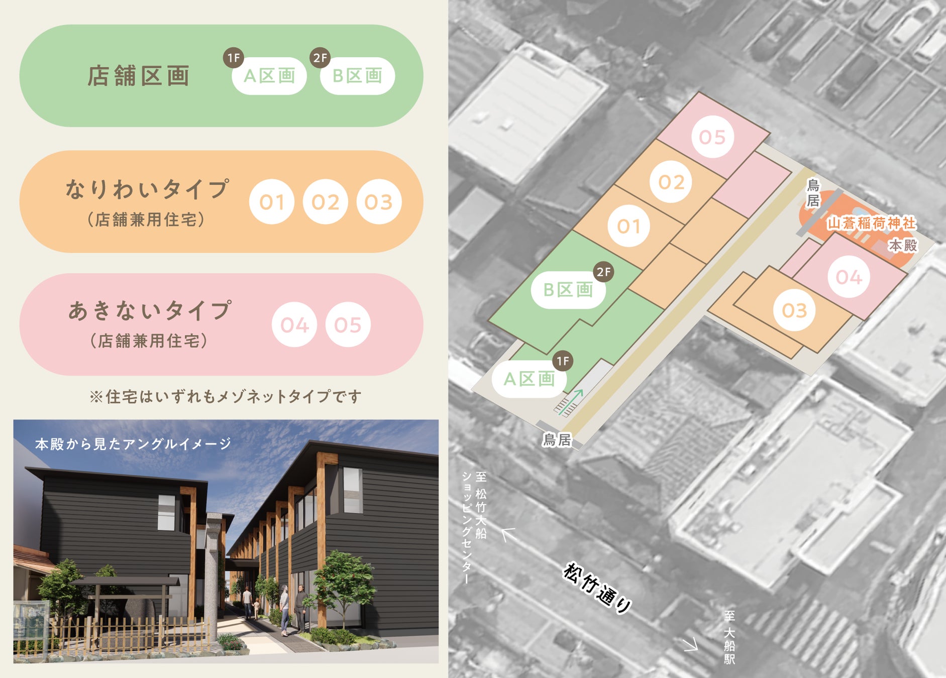 本施設は、松竹通り側の鳥居から山蒼稲荷神社の本殿をつなぐ参道を挟むように2棟で構成され、店舗2区画と店舗兼用住宅5区画を有した商住一体型の複合施設です。建物の外壁には、鳥居をイメージした木造門型フレームが連なり、地域のみなさまに愛され続ける山蒼稲荷神社との親和性にこだわったデザインとなっています。建物は、2025年11月中旬に竣工を予定しております。今後、随時内覧会・入居相談会等を実施してまいります。