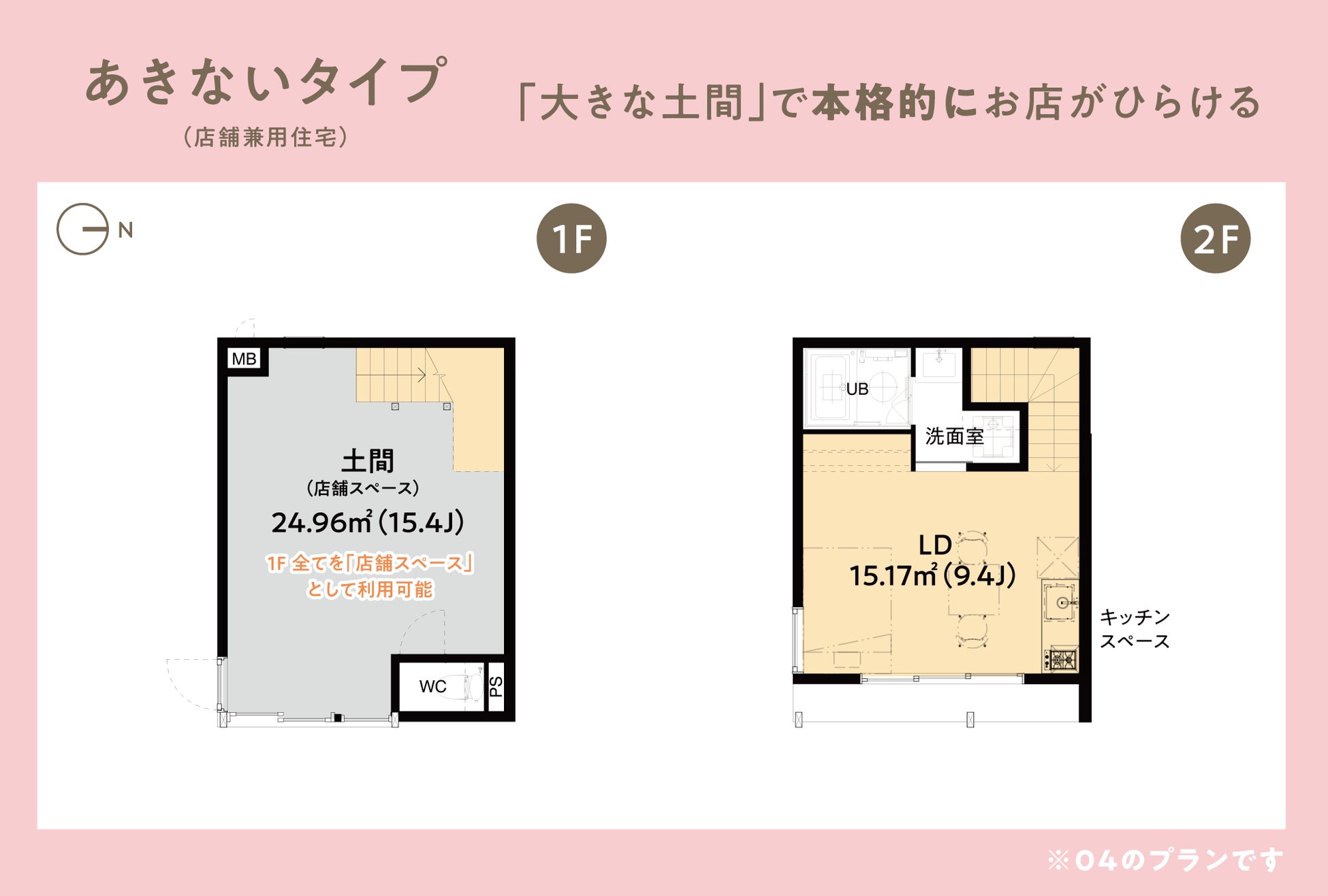1階(15.4畳)を丸ごと大きな「土間スペース」として客席を設けられたり、より本格的な店舗運営が可能なタイプとなっています。2階が住居スペースとなっています。