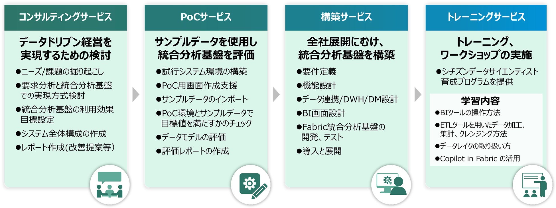 1. データ活用に必要な機能を統合した Microsoft Fabric を活用し、導入コンサルティングからPoC、構築、シチズン・データサイエンティストの育成トレーニングまで、企業のニーズに合わせたサービスメニューを提供