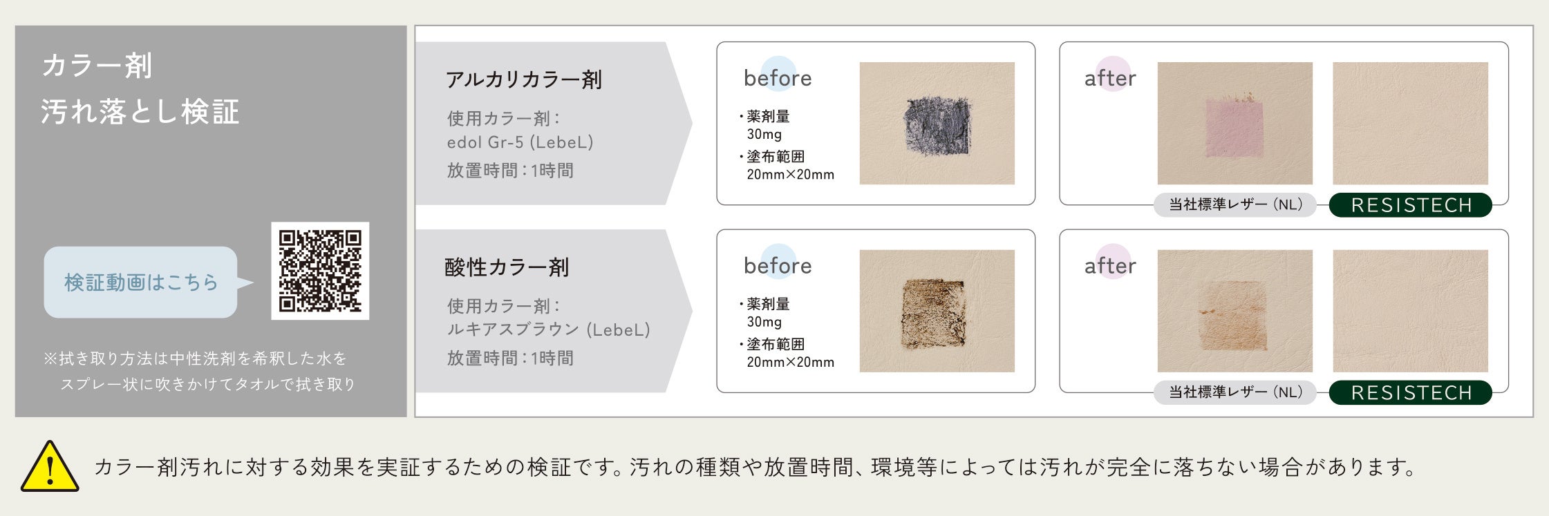 今回タカラベルモントが開発した新レザー「RESISTECH」は、カラー剤などの汚れを簡単に拭き取る事が可能。汚れによるストレスから解放され、サロン空間に新たな選択肢を提供します。