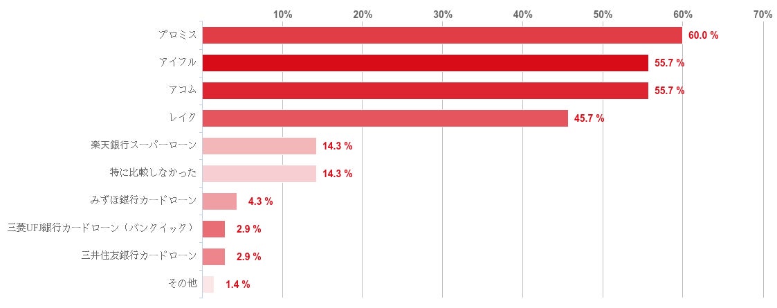 SMBCモビットと同じ大手の消費者金融を比較対象としている人が多かった。SMBCモビットの金利はもちろん、審査や手続きの利便性・スピードなどを比べていると考えられる。