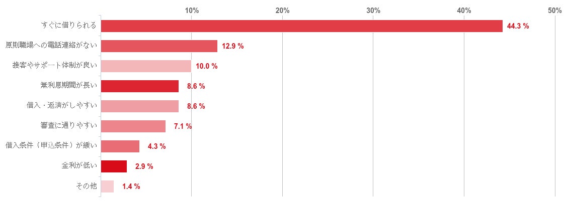 SMBCモビットのメリットには、「すぐに借りられる」ことをあげた人が44.3%で最も多かった。なお、そのほかには「原則職場への電話連絡がない」「接客やサポート体制が良い」などを挙げる人もいた。